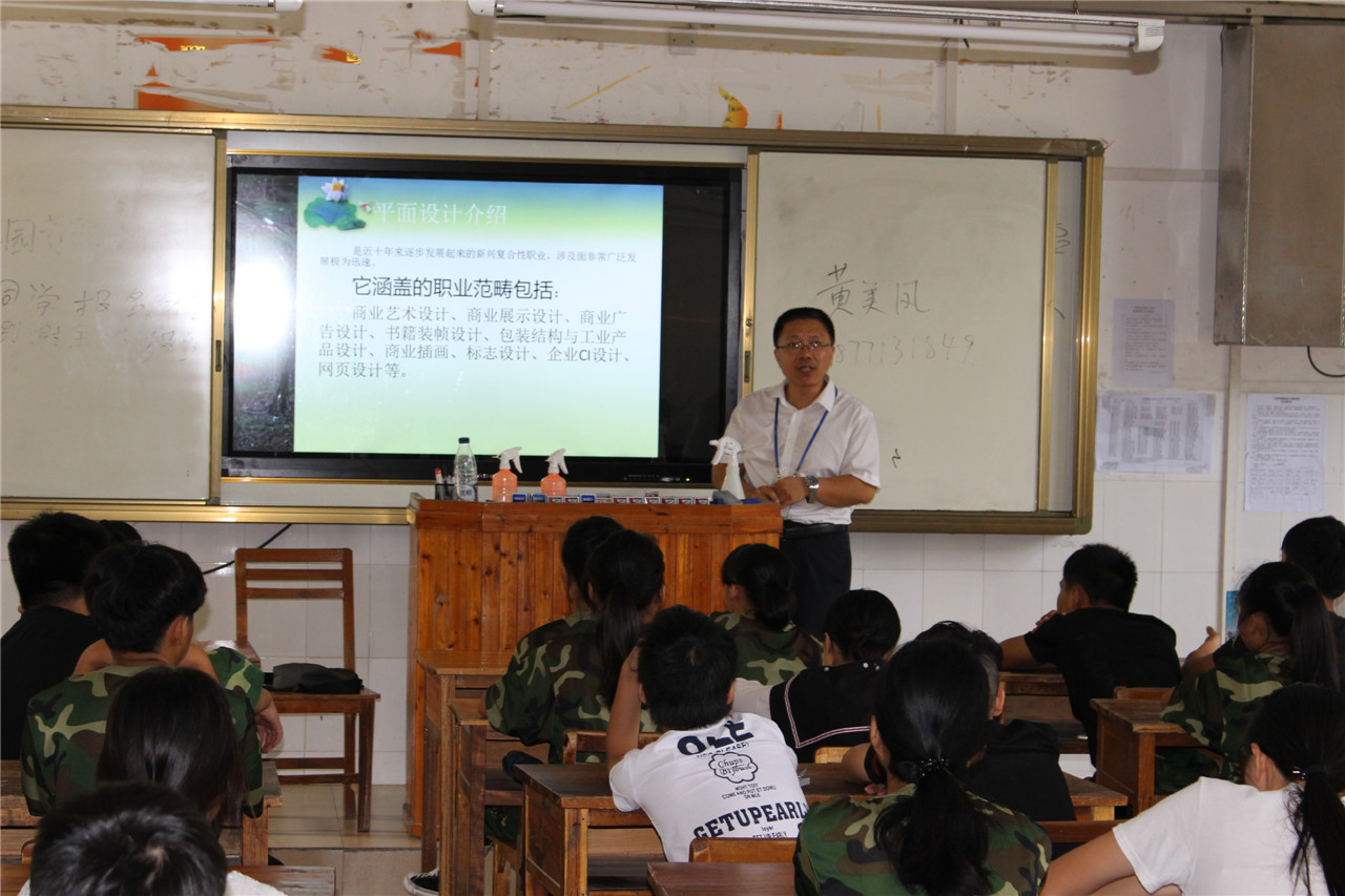 计算机广告制作专业主要由邓晖老师来负责讲解。邓老师以我校一名学生成功的案例作为引子,给学生介绍了我校计算机广告制作专业的发展史、该专业所安排学习的核心课程、所需掌握的技能、毕业时所需要考取的技能证书以及就业的方向。因为有了成功案例的激励,学生兴趣浓厚。