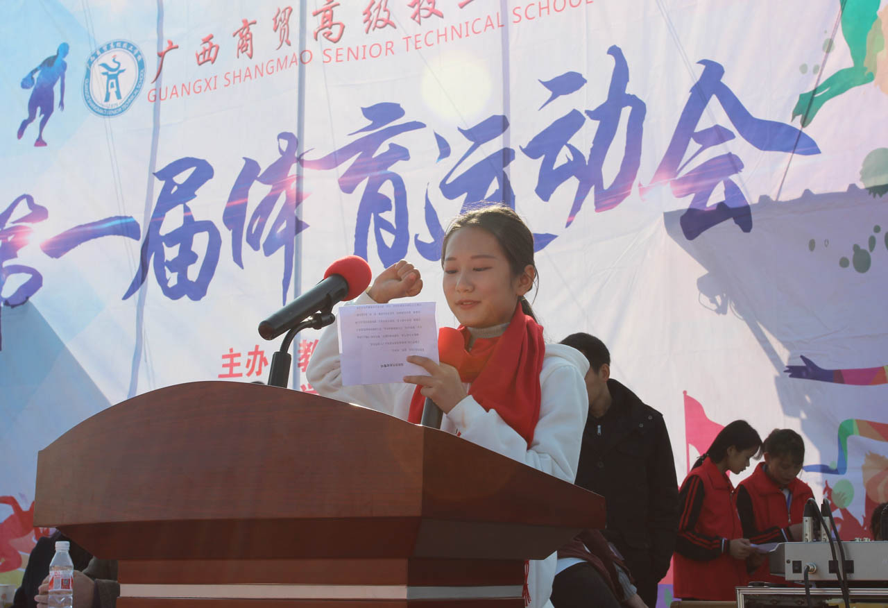 裁判员、运动员代表在主席台上庄严宣誓。随后,校长、党委书记黄学军宣布:“广西商贸高级技工学校第一届运动会开幕!”