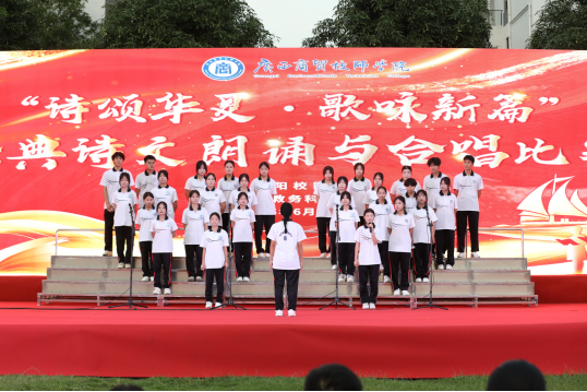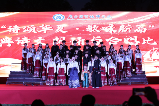 决赛当晚,壮妞妞合唱团用一曲《山歌爬满山坡》点燃现场氛围,壮乡风韵扑面而来,比赛正式拉开序幕。上半场,学生们精神抖擞、意气风发,用铿锵有力的歌声抒发对革命先辈的崇高敬意,对党和祖国的无限热爱。中场时分,学生们激情演绎了两首充满青春活力的歌曲,将比赛推向新的高潮。下半场,学生们以声传情,以诵明志,LED大屏上,水墨丹青随着诗的意境不断变换,诗画交融间,将中华经典诗词的魅力展现在全场观众眼前。最后,青年教师和学生们分别带来了《春江花月夜》诗朗诵和民族特色舞蹈《绣球女》,绣球翻飞间尽显广西特色民族风情。一首首经典诗词,一曲曲革命赞歌,让比赛现场化作一片红色的海洋,赢得观众的阵阵欢呼和掌声。