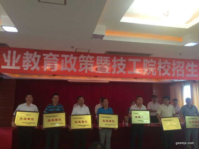 5日上午的会议由自治区人社厅张远处长主持。浦北县领导在会上致词,介绍了浦北县经济社会发展的基本情况并对此次会议的召开表示热烈的祝贺。自治区人社厅黄智宇副厅长在会上作了重要讲话,他提出了此次会议的主题:贯彻落实国务院《关于加快发展现代职业教育的决定》、人力资源和社会保障部《关于推进技工院校改革创新的若干意见》和自治区人民政府《关于贯彻<国务院关于加快发展现代职业教育的决定>的实施意见》精神,紧紧围绕“高端引领、校企合作、多元办学、内涵发展”的办学方针,坚持学制教育与职业培训并举,深化技工院校教育教学改革,创建技工院校发展新机制,开创技工院校招生新局面,实现今年技工院校招收新生4.5万人。会上,他通报了2014年广西技工教育发展的基本情况并阐述了招生的主要工作措施,他还对我区技工教育发展面临的机遇与挑战作了具体的分析,最后,他提出了2015年我区技工院校的改革发展思路。上午的会上,熊艳副处长宣读了《关于表扬2014年全区技工院校招生工作成绩突出的单位和个人通报》的文件,包括我校在内的11所技工院校作为招生工作成绩突出单位受到了表扬,黄学军校长在主席台上接受表彰并领取“招生工作先进单位”牌匾。据悉,自治区人社厅在全区技工院校中共评选出57名招生工作成绩突出的个人,我校岑锦华助理、何昌武副科长受到表彰。