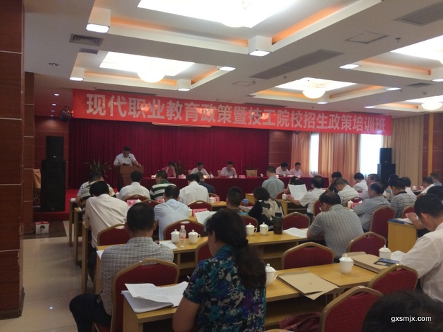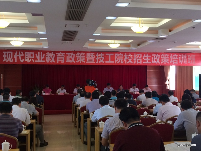 2015年5月5日,由自治区人力资源和社会保障厅举办的现代职业教育政策暨技工院校招生政策培训班在钦州市浦北县召开,各市人力资源和社会保障局的相关领导及各技工院校的校长、分管招生工作的负责人等近200人参加了会议。 我校黄学军校长,校长助理、招生就业科科长岑锦华老师,招生就业科副科长何昌武老师等3人参加了此次会议。