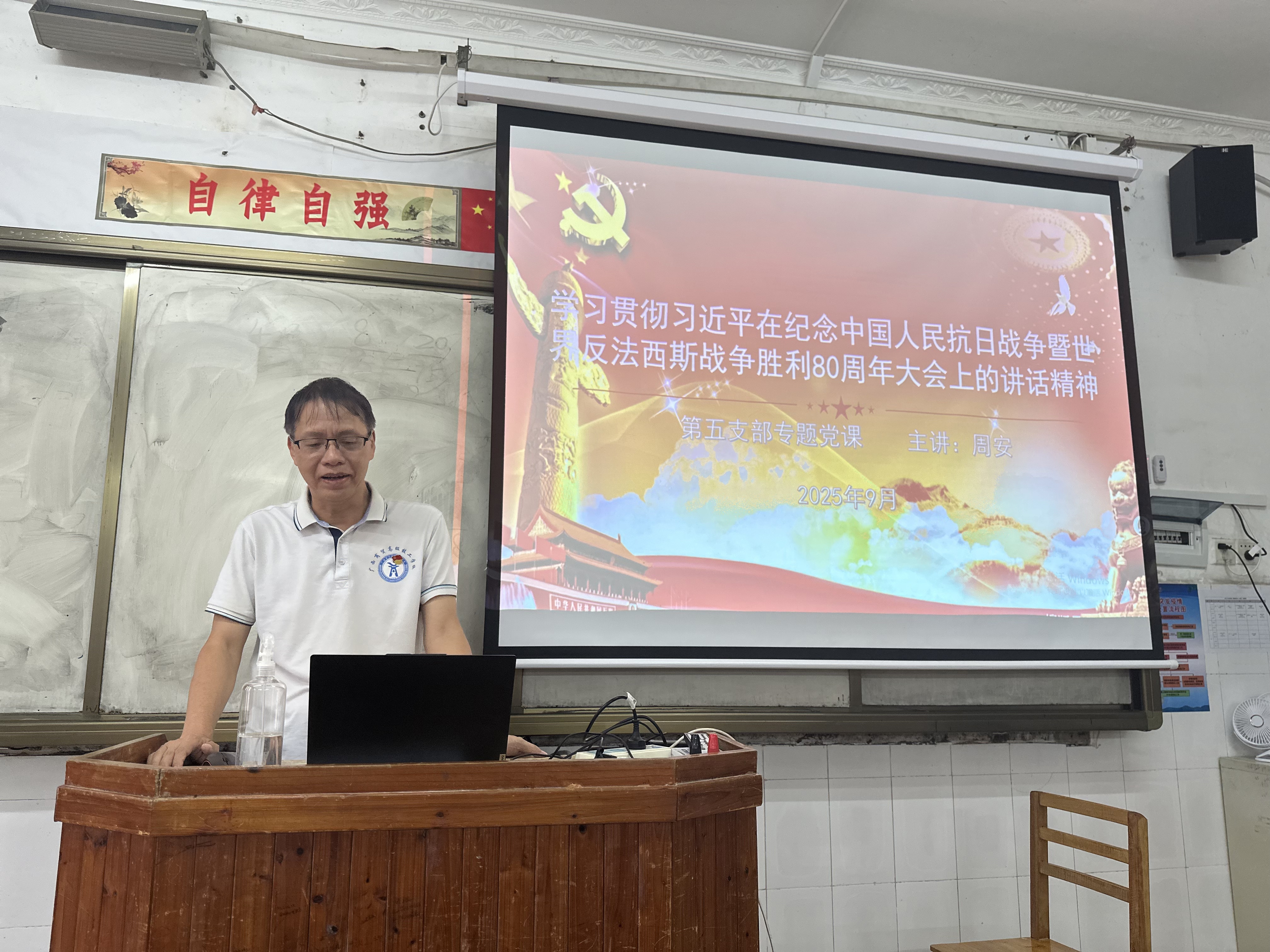 2025年9月26日下午,第五党支部在大岭校区召开集中理论学习会。学院党委专职副书记、工会主席周安同志重点围绕“学习习近平总书记在纪念中国人民抗日战争暨世界反法西斯战争胜利 80 周年大会上的重要讲话精神”等内容上党课。