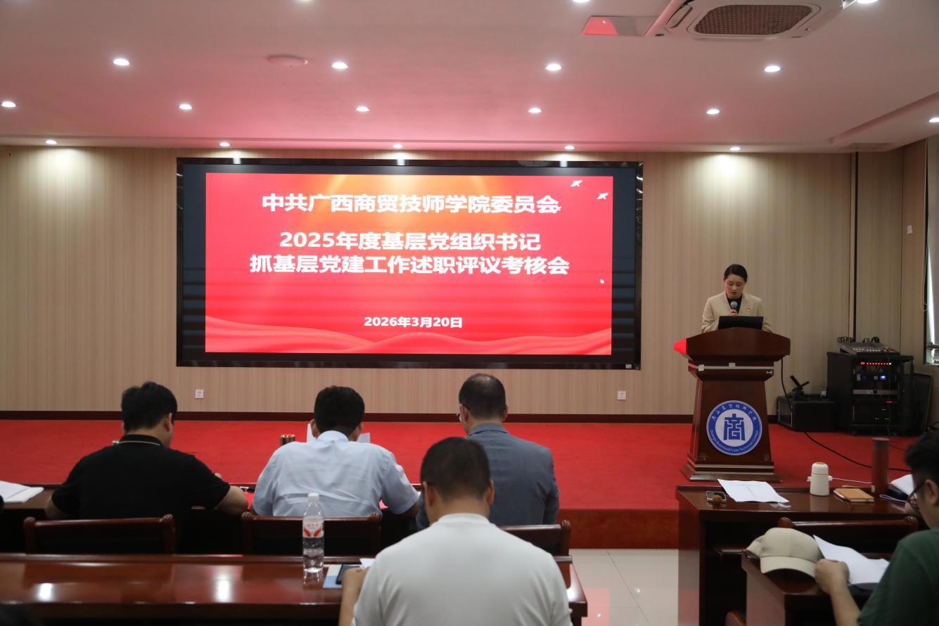 3月20日下午,广西商贸技师学院2025年度基层党组织书记抓基层党建述职评议考核会在明阳校区笃学楼一楼报告厅召开。学院党委书记宋成多出席会议并讲话,党委副书记、院长李洁琛及其他领导班子成员、党委委员、纪委委员、各支部委员及党员代表参加会议。会议由学院党委委员、党建办主任陆菲菲主持。