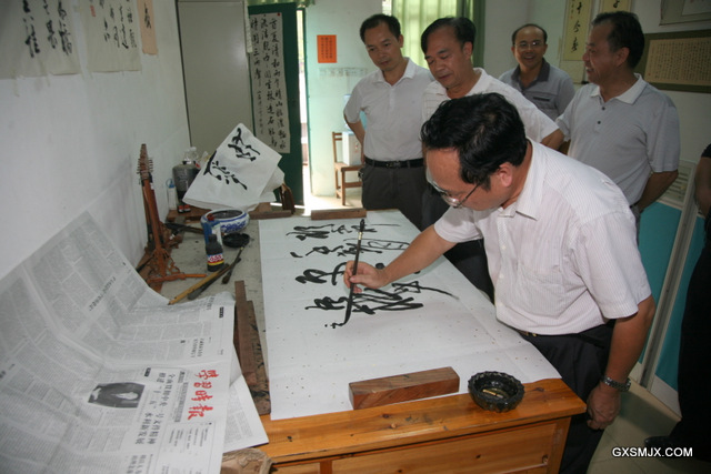 胡主任是我们广西的知名书法家,他在繁忙的工作之余,仍能潜心研究中华文化墨宝,勤于笔耕,作品不断,造诣颇深,广受好评!胡主任能在百忙中新临我校指导和题字,对我校全体师生和校友是最大的鼓励和鞭策!我们应倍加珍惜,不辜负上级领导的厚望,克难攻坚,争取成功申报“国家重点技工学校”,努力为助推学校新一轮的“腾飞”作出积极的贡献!