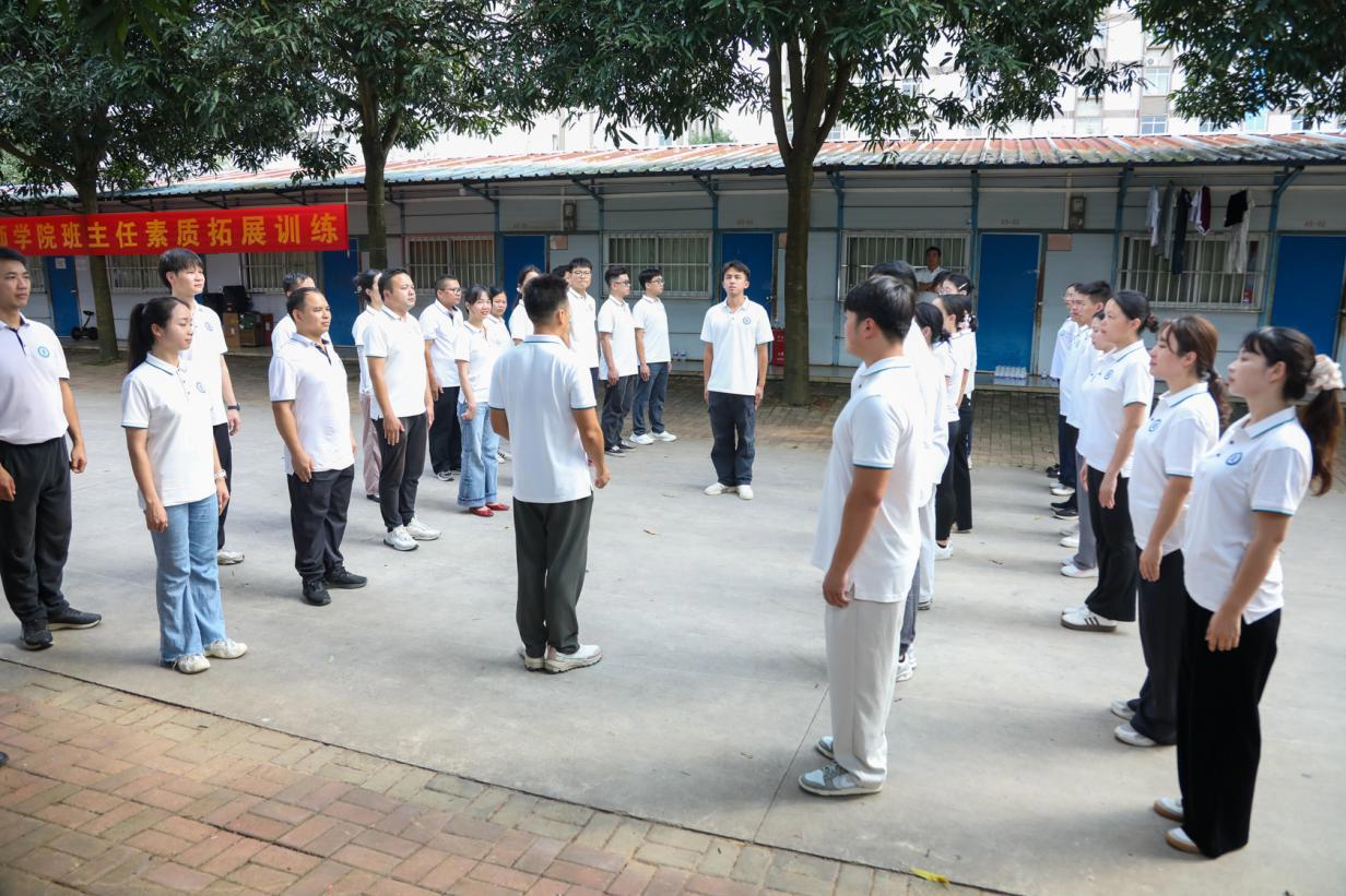近日,我院在推进学生以“形”化“行”专项整治工作中,对班主任的班级管理水平提出了更高的要求。为强化学生日常行为管理、巩固整顿成果,推动后续工作落地见效,10月10日下午,学院特在明阳校区开展班主任专项素质拓展训练。学院党委书记、院长宋成多,党委委员、副院长岑锦华亲临现场。本次素质拓展参训人员包括明阳校区班主任、体育教师、学生科与保卫科工作人员及教官队伍。