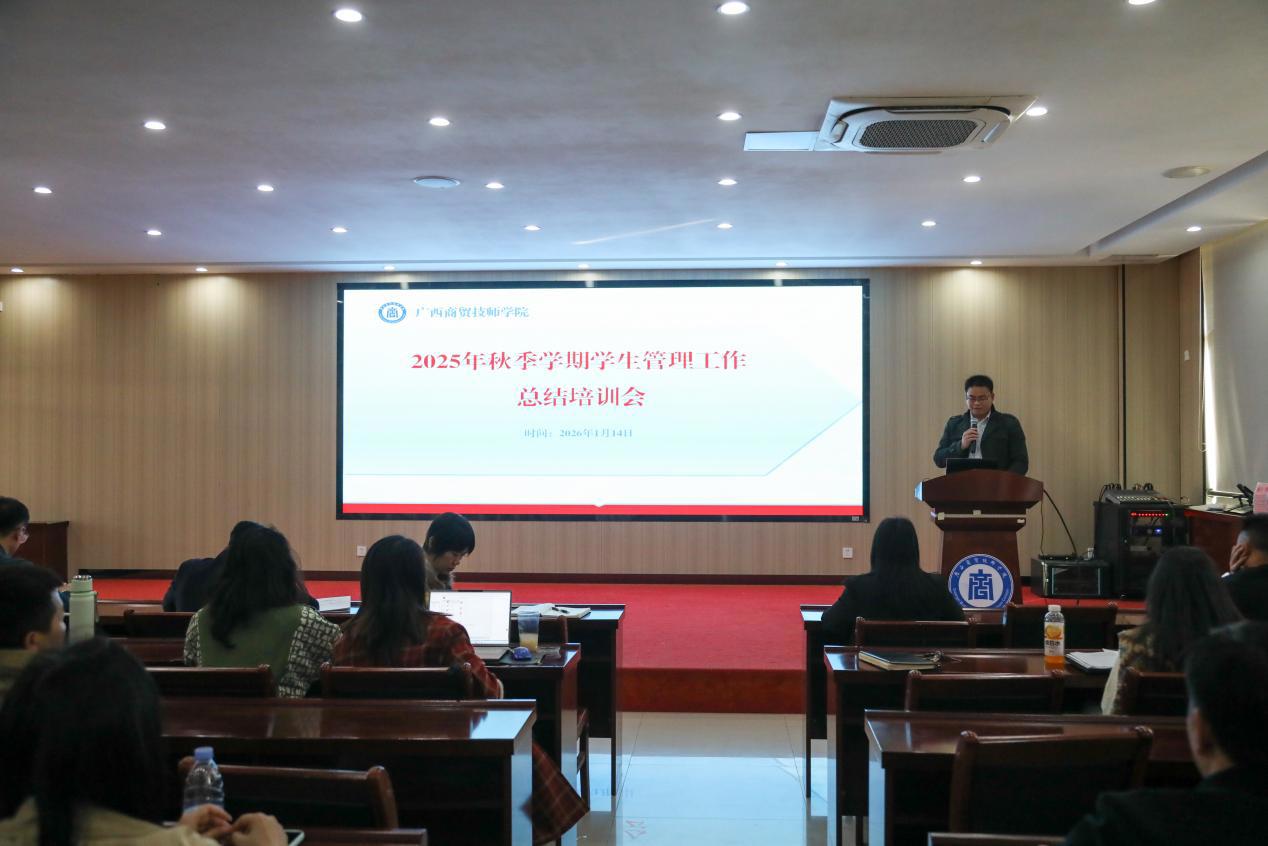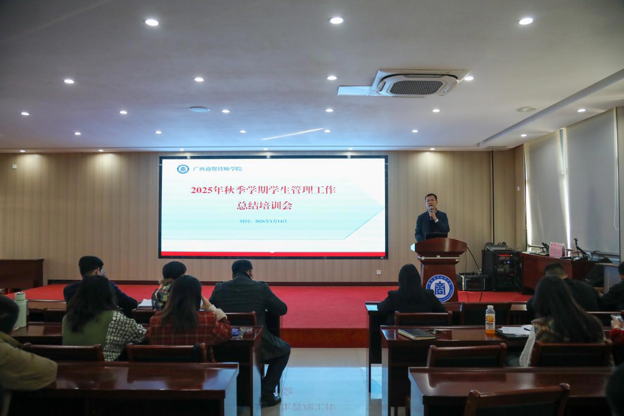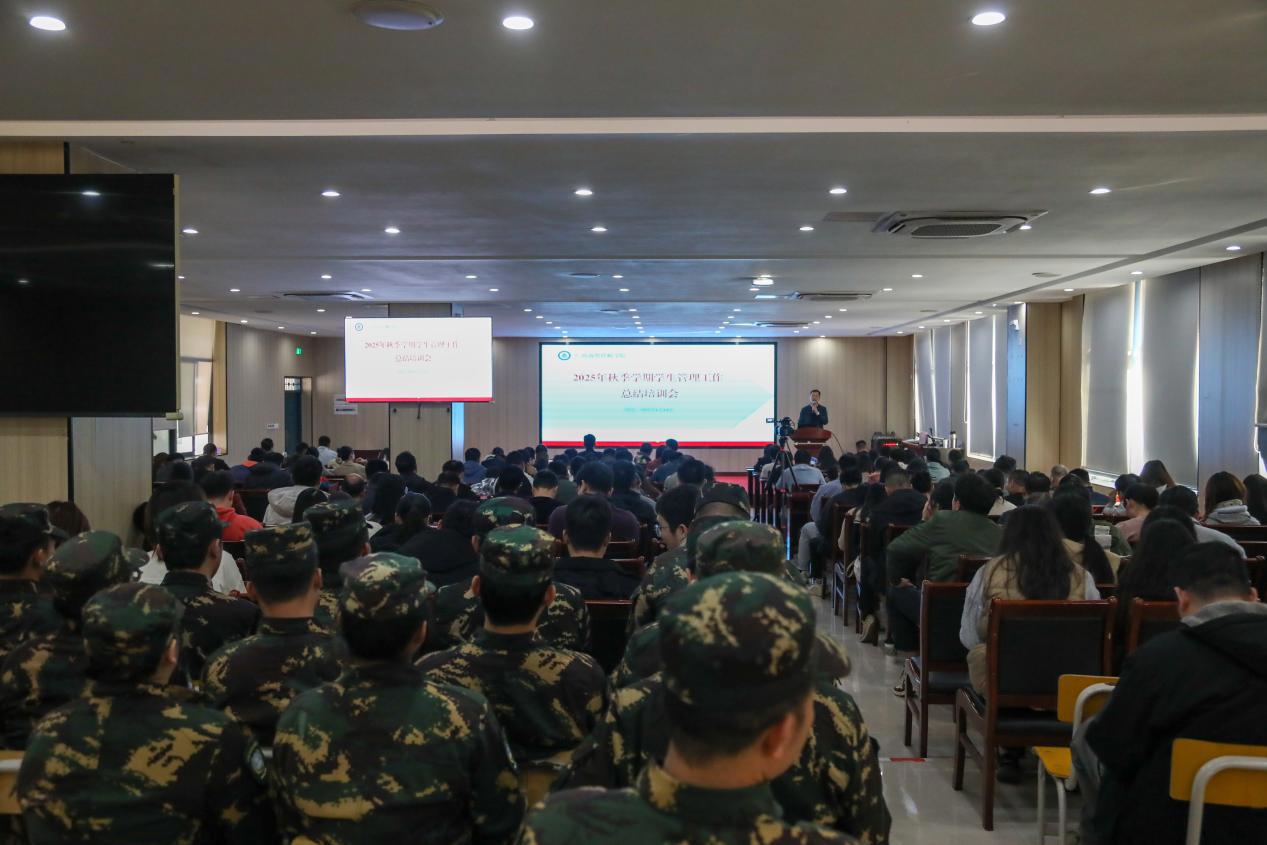 为梳理学期工作、优化管理策略,1月14日下午,我院在明阳校区召开了2025年秋季学期学生管理工作总结培训会。保卫科科长、团委书记黄立杰以及学生科科长党斌分别就本科室工作进行了总结。党委委员、副院长岑锦华,全体班主任、相关科室工作人员及教官队伍参加了此次会议。