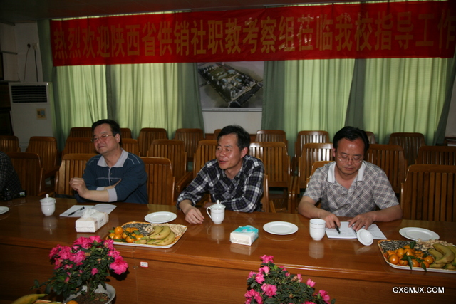 座谈会由刘为民处长亲自主持。刘为民处长首先代表广西区供销社胡德才主任以及陈 立生副主任,对远道而来的兄弟省社职教考察组表示热烈的欢迎。座谈会上,刘为民处长、黄学军校长先后向陕西省社职教考察组简要介绍了我校的办学情况。刘处长在介绍中提到:我校是资质较老的省部级重点技工学校,尤其在2010年完成了南宁、百色两校合并重组之后,明阳新校区的建设成为“十二五”期间全区供销社系统职业教育的重点攻坚建设项目之一。两校合并重组得到了广西区政府的大力支持,这样跨地区、跨城市的校区合并重组在全区职业教育体系中尚属首次,是大胆的创新之举,实现了学校的跨越性发展。紧接着,黄学军校长代表学校对陕西省社职教考察组的到访表示热烈的欢迎,并围绕“德育优先、和谐发展、追求卓越”的办学理念简短介绍了学校的教育教学成果。黄校长说,希望陕西兄弟学校考察组多提宝贵意见和传经送宝,共谋职业教育的发展。李保平副处长代表考察组在座谈会上发言,他首先说明了考察组此行的目的,主要是以学习交流办学经验,对我校整洁优美的环境和师生积极向上的精神面貌已经给他留下了深刻的印象。他谦虚的表示,希望在接下来的考察走访中,学习到更多培养学生全面发展的综合素质和职业素养的成功做法。