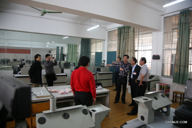 参观期间,我校教务科韦绍春科长特别向考察组介绍了现代物流实训室,秉持“以市场需求为导向”的办学理念,南宁作为东盟自由贸易区的核心城市,学校预见了未来物流人才的缺口,将大力发展物流专业特色,继续完善物流实训设备设施。在餐厅服务技能实训室,李副处长了解到我校多个专业采取了校企合作、定向就业的办学方式,他说,这样的方式很好的促进了职业人才的培养,提高了学校的教育教学质量。在KTV与家庭影院实训室,考察团一行观看了我校最新拍摄的校情宣传片,宣传片时长17分钟,较完整的展现了我校示范性学校的建设、专业建设、校园文化建设、教学管理、学生管理、校企合作等情况。观看完宣传片,黄校长向考察组介绍当前我校的主要任务是完成国家重点技校的申评工作,对于已经通过申评的陕西省第二商贸学校,我校期待更进一步的学习和交流。