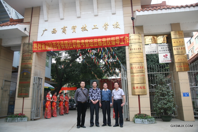陕西省供销合作社政治处李保平副处长(左二)、陕西省商贸学校王校长(右一)、校办公室刘主任(左一)、第二商贸学校王校长(右二)在学校门口合影留念