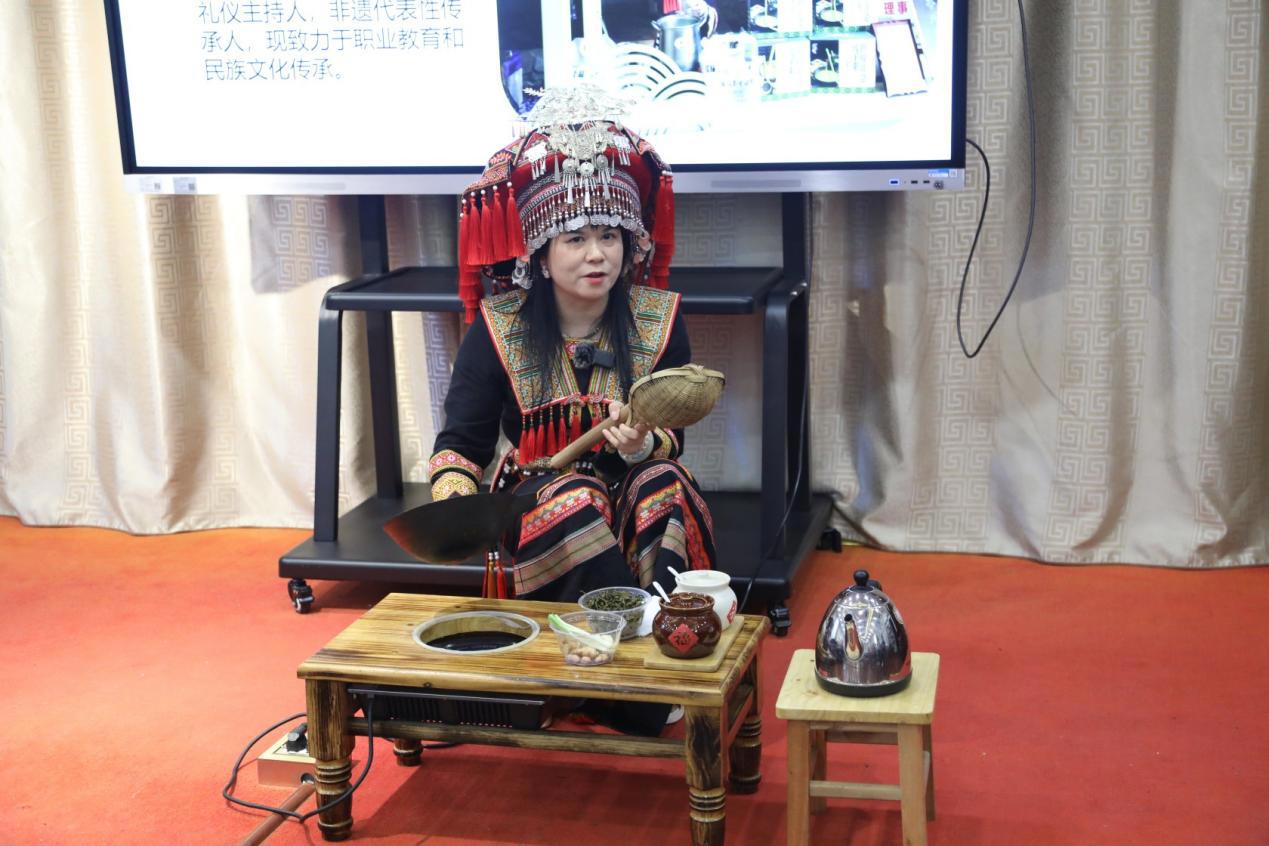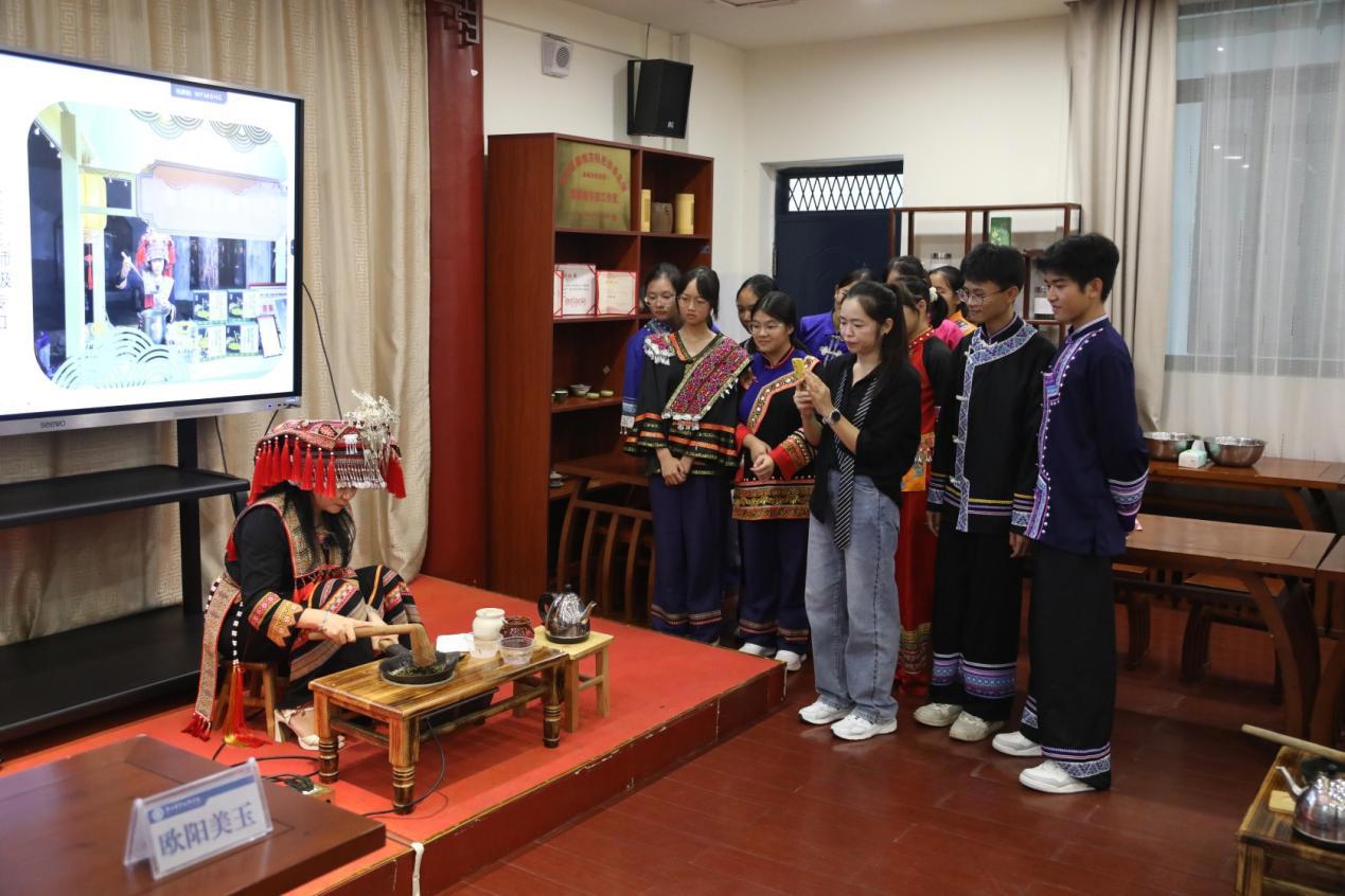 紧接着,我院学生科副科长、“瑶族油茶习俗”非物质文化遗产县级代表性传承人欧阳美玉,现场展示油茶制作技艺。从茶叶炒制、生姜捶打,到泉水熬煮、配料搭配,欧阳美玉老师娴熟的手法与细致的讲解,让师生直观感受传统技艺的精妙。