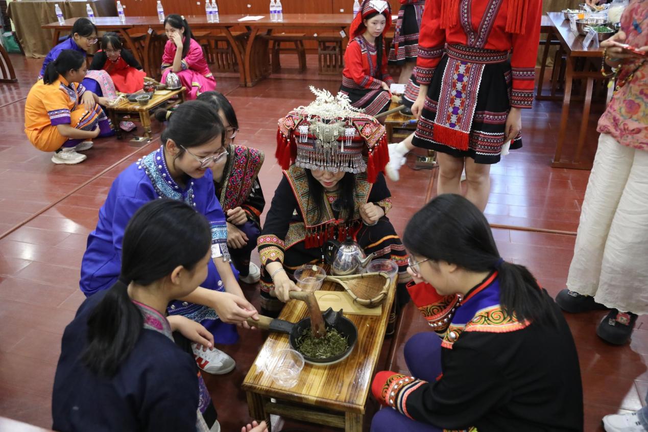 展示结束后,沛鸿民族中学师生纷纷上前体验。在欧阳美玉、钟丹阳、杨曼、麻新婷、莫莉菊等几位老师的指导下,大家亲手拿起油茶槌,捶打姜蒜,煎炒茶叶,亲身感受油茶制作的“火候”与“力道”。当热气腾腾、香气四溢的油茶搭配麻蛋果、排散等传统配料端上桌,师生在品尝中回味民俗风情,在互动中深化对非遗的认知,现场氛围热烈温馨。