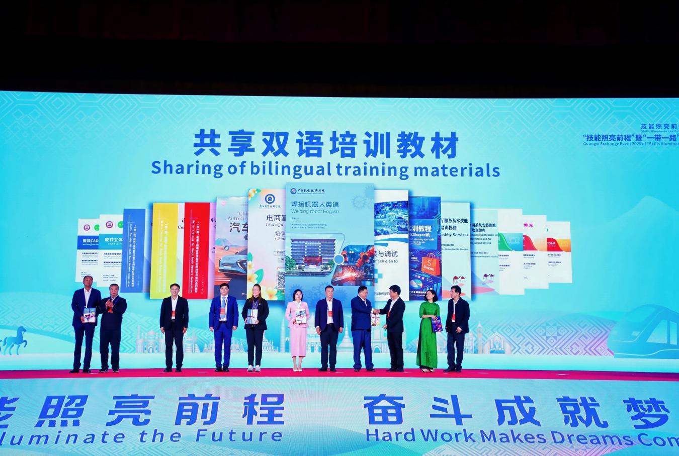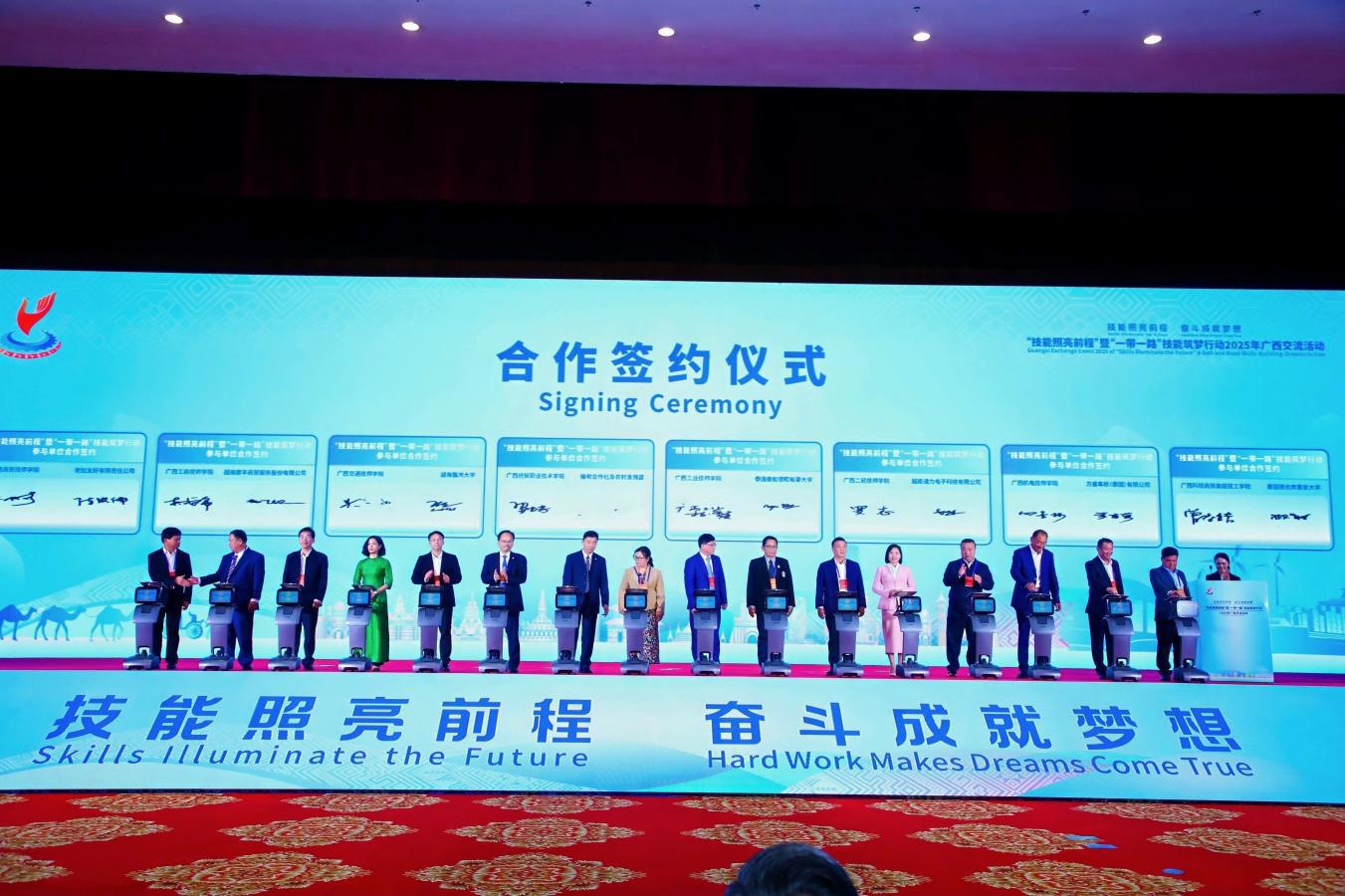 活动中,学院积极参与合作签约环节,与相关单位达成技能人才培养合作意向;在共享双语培训教材环节,获取职业技能双语教学资源,为国际化教学提供有力支撑。同时,团队见证了广西技能筑梦平台发布、境外职业技能认定目录公布等环节,聆听嘉宾经验分享并响应相关合作倡议。