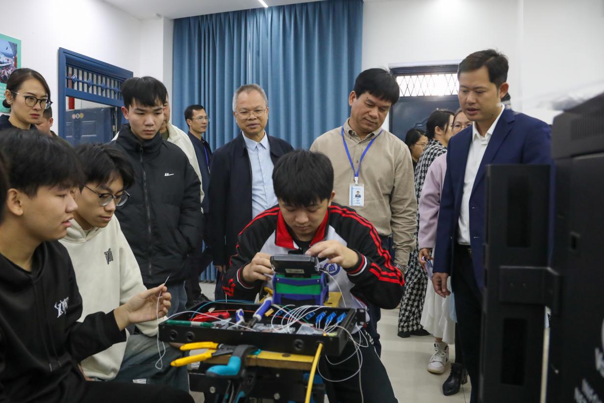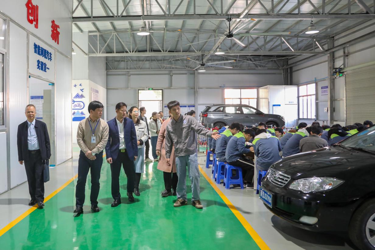 江权峰理事长一行在我院领导陪同下,实地参观了电子商务大师工作室、周黎维大师茶艺工作室、信息网络布线世赛基地、开放式消防应急虚拟仿真实训基地、世界技能大赛商品展示技术项目广西集训基地,以及新能源汽车检测与维修、电子技术应用、工业机器人应用与维护、智能网联汽车技术应用和烹饪等多个专业实训基地,全面深入了解我院办学情况。
