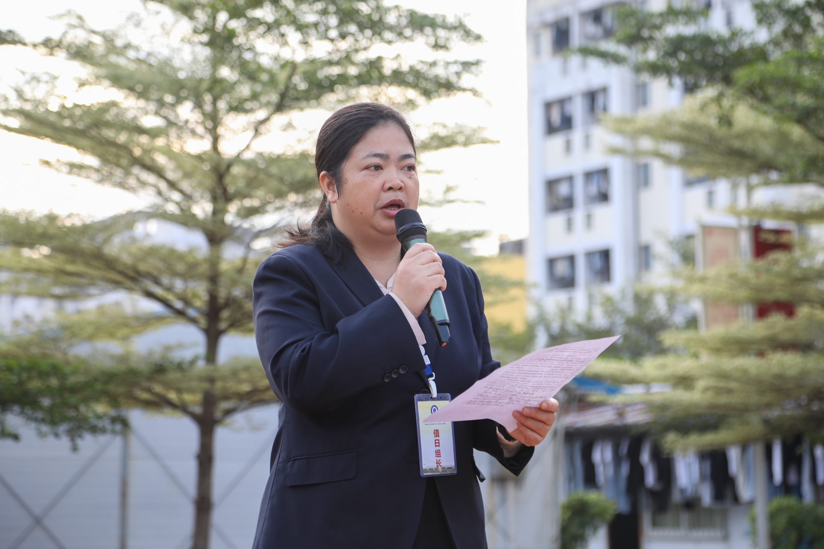 大岭校区,龚慧娟在国旗下讲话。她先是纪念抗美援朝纪念日,呼吁学子传承先烈担当精神,将其融入日常言行;接着总结2025级新生军训在体能纪律淬炼和品格养成方面的成果,为新生成长奠基;同时强调师生需遵守校园秩序、落实安全责任、关注身心健康,以实际行动共筑校园和谐美好。