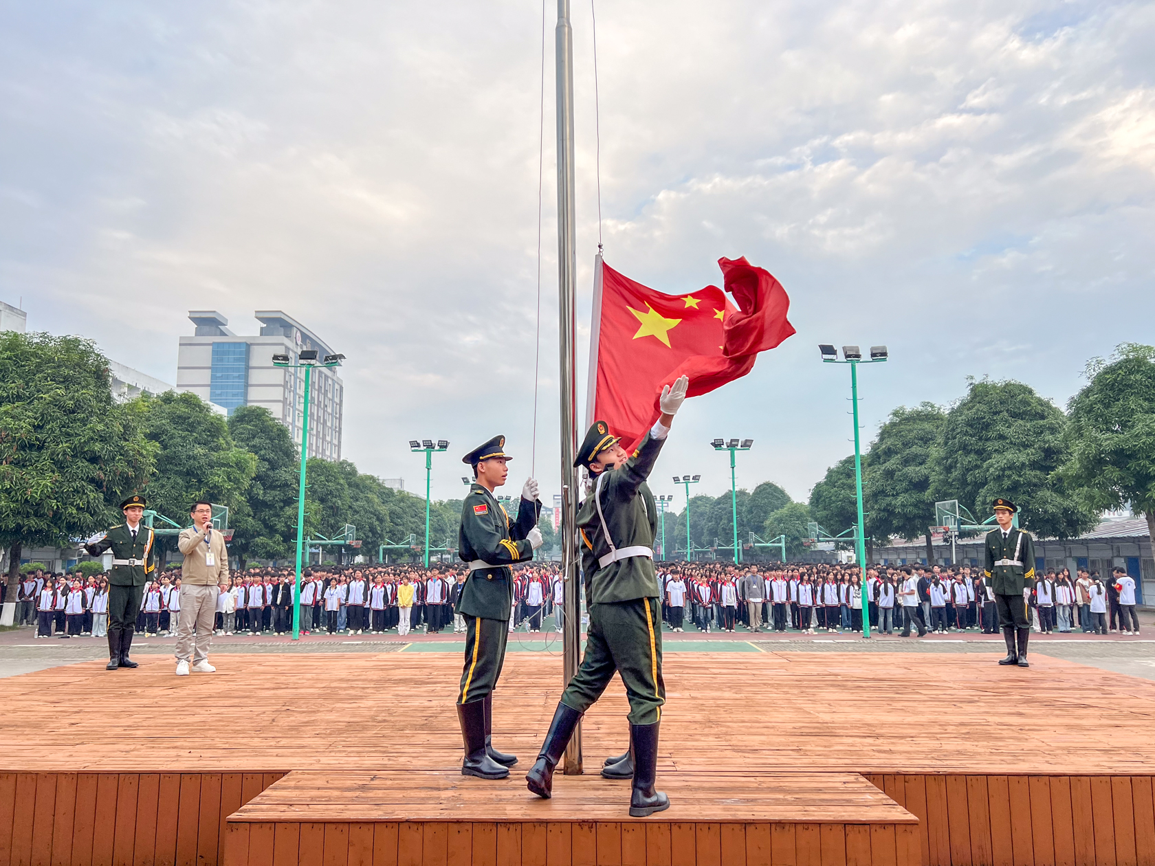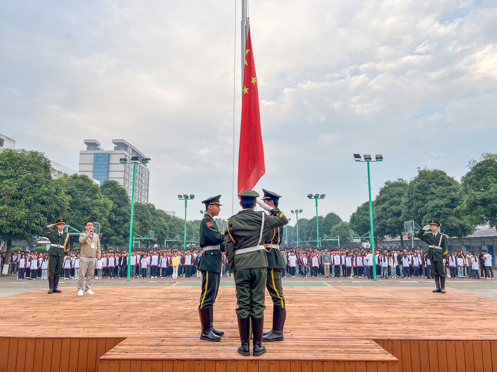 11月17日清晨,广西商贸技师学院2025秋学期第十四周升旗仪式在明阳、大岭两校区同步举行。全体师生身着统一服饰,整齐列队,伴随国歌声,向冉冉升起的国旗行注目礼。