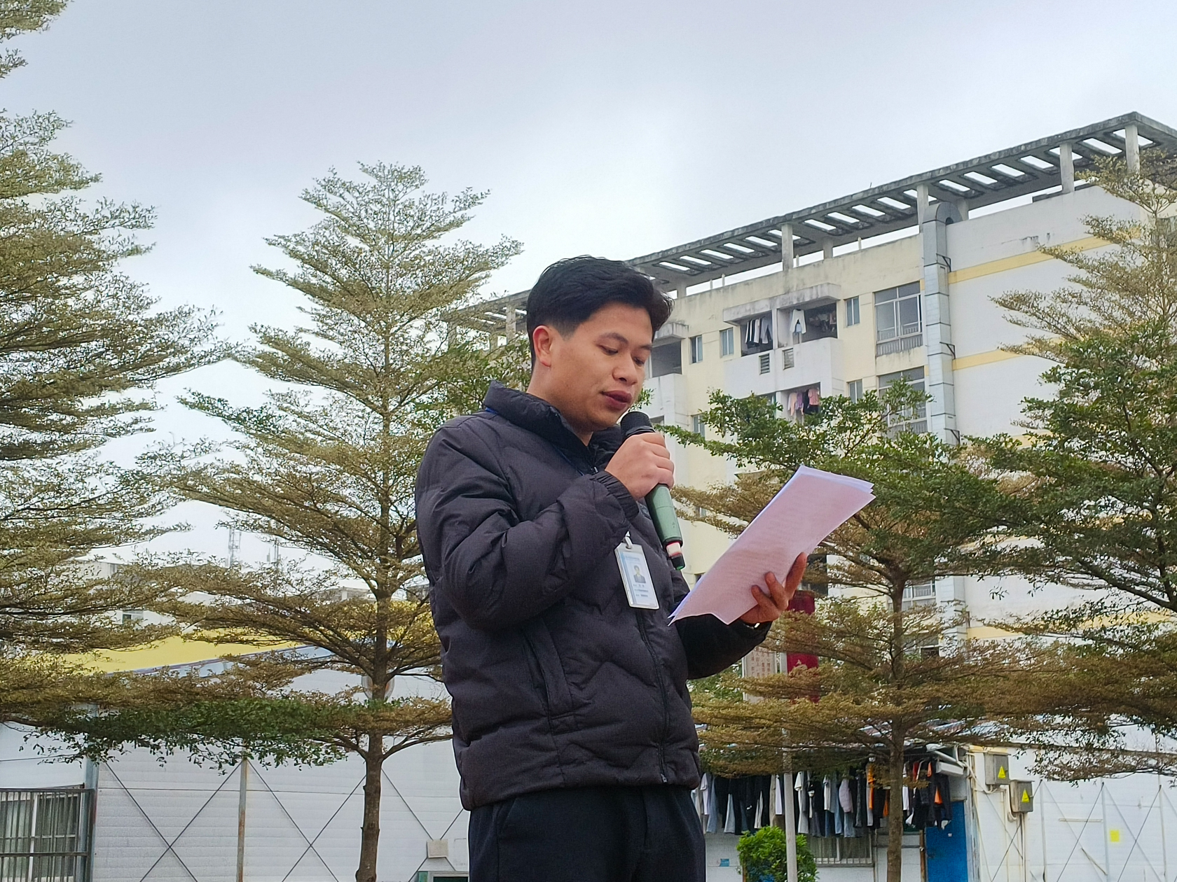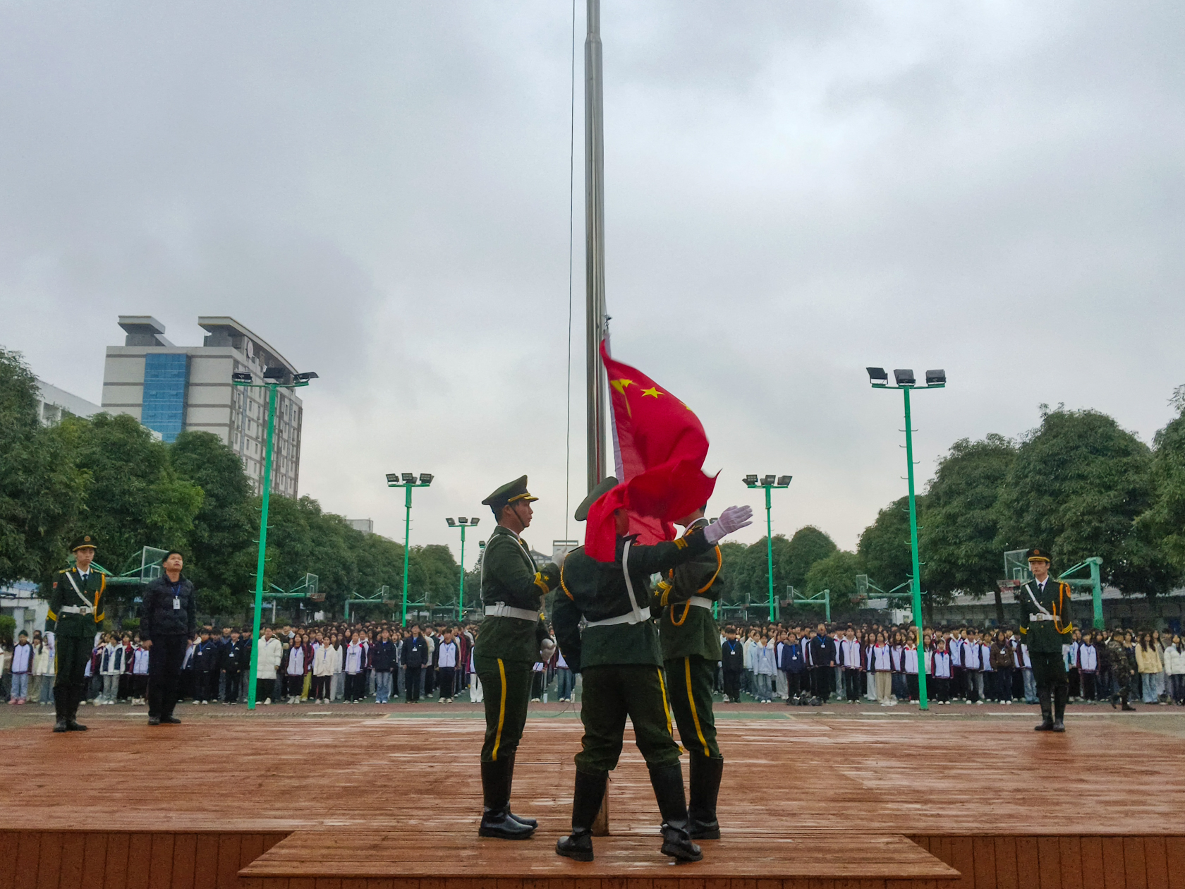 1月5日清晨,广西商贸技师学院第二十一周升旗仪式在大岭、明阳两校区同步举行。教学督导研究室主任邓力高、学生科副科长程聪分别在两校区发表国旗下讲话,围绕寒假规划、期末备考及校园管理等核心内容,向全体师生作出部署并发出倡议。