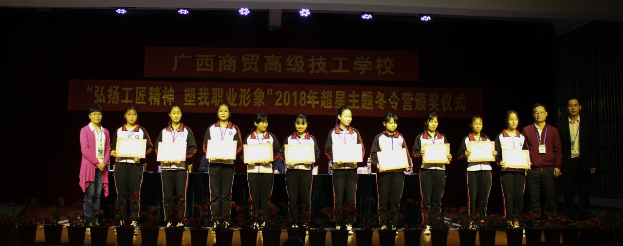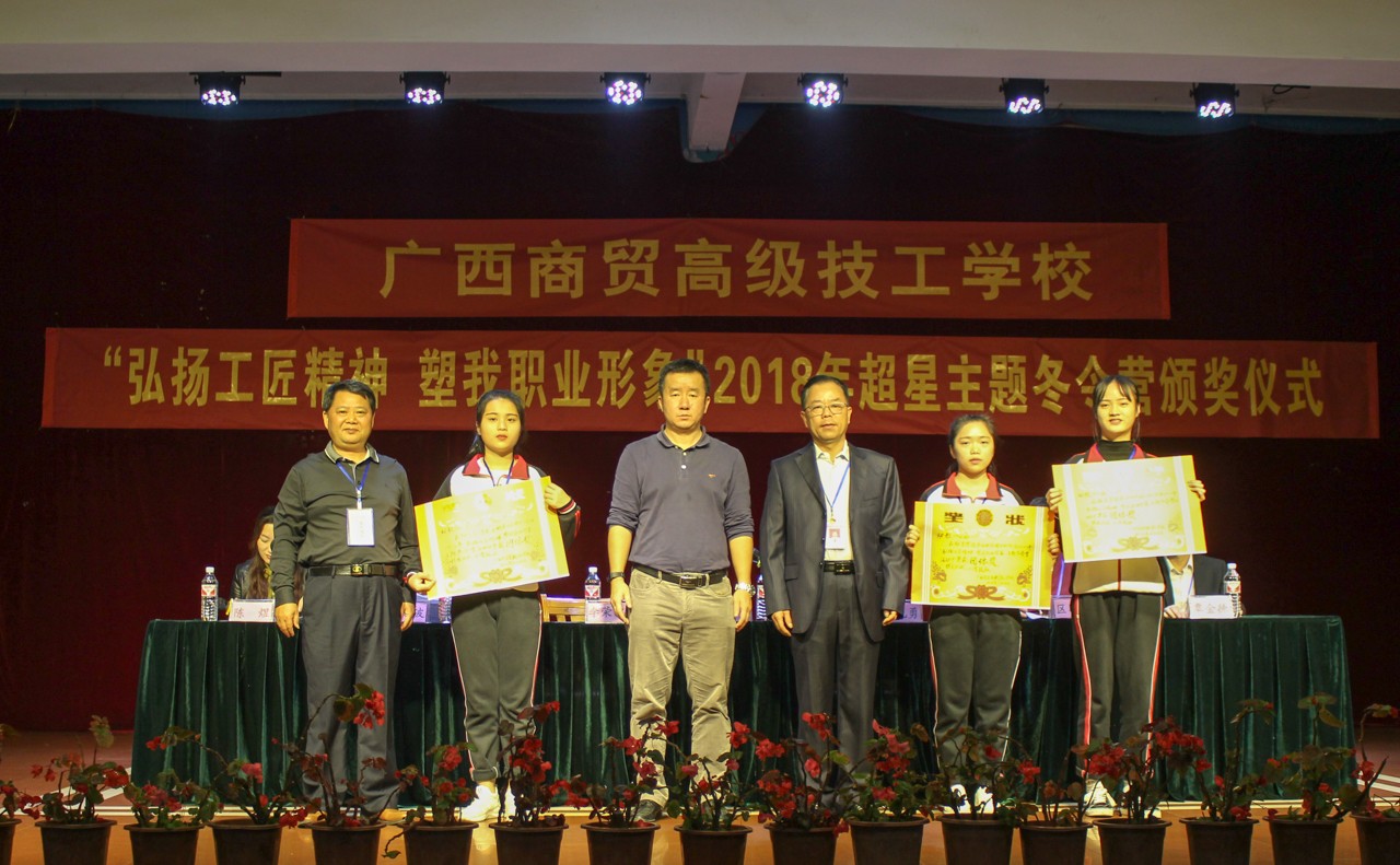 表彰大会上,李荣波副校长宣布评选结果。校长助理黄红波、教务科科长区军华、学生科副科长覃金德为优秀奖、一二三等奖颁奖;黄校长、李副校长、熊总经理为团体奖代表颁奖;校长黄学军为全国排名第32名的樊如梅颁发特等奖;覃金德副科长代表学校接受熊光勇总经理颁发“全国优秀组织奖” 。
