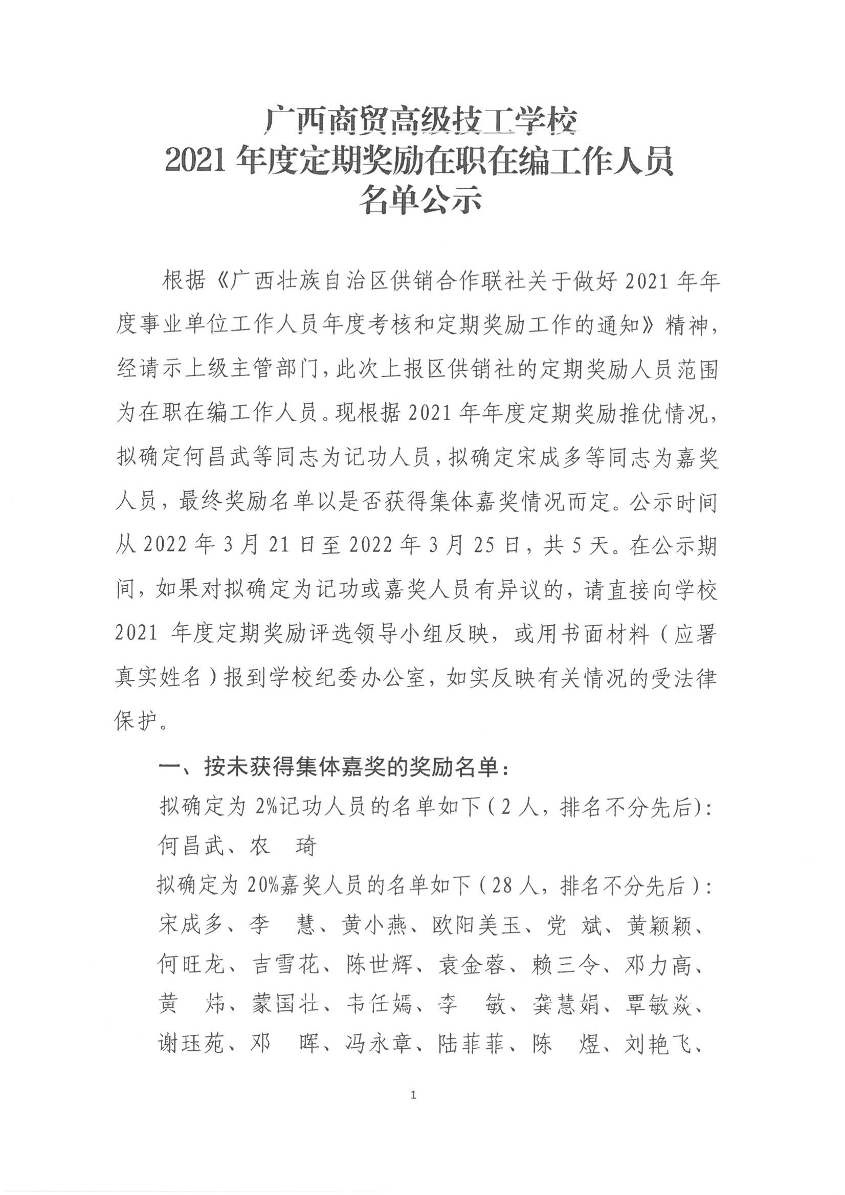广西商贸高级技工学校2021年度定期奖励在职在编工作人员名单公示