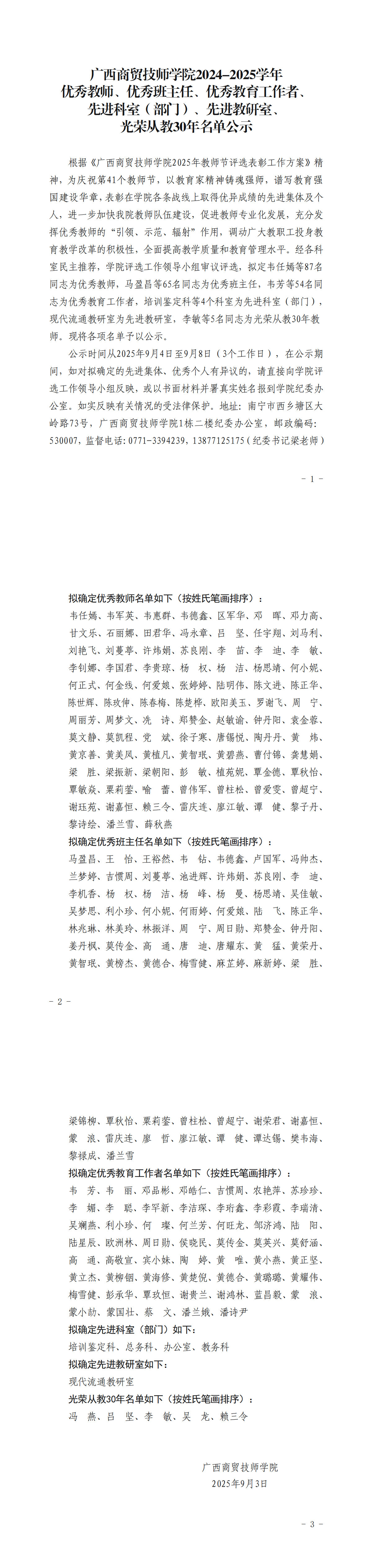 广西商贸技师学院2024-2025学年 优秀教师、优秀班主任、优秀教育工作者、 先进科室(部门)、先进教研室、 光荣从教30年名单公示