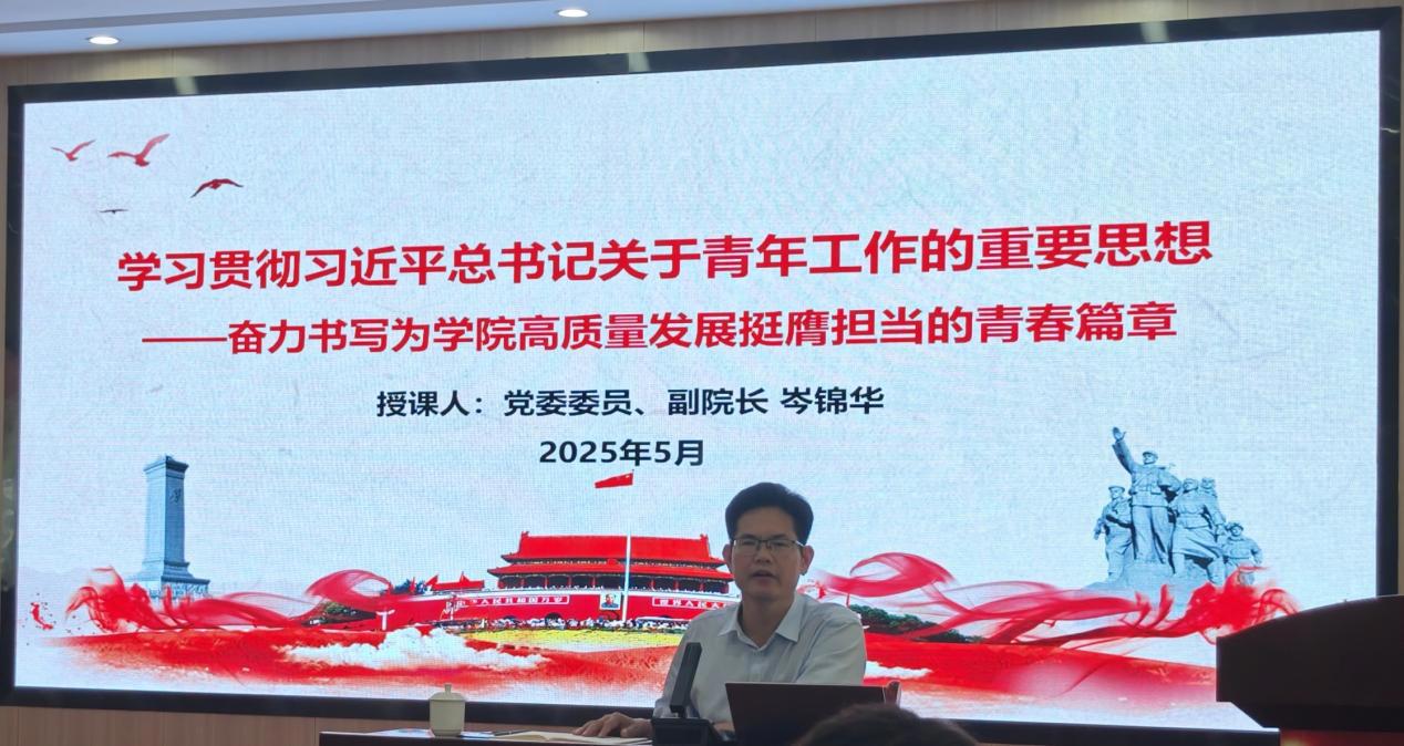 仪式最后,由岑锦华副院长为本次开班授第一课,他以“学习贯彻习近平总书记关于青年工作的重要思想——奋力书写为学院高质量发展挺膺担当的青春篇章”为主题展开授课,课程中深入学习了习近平总书记关于青年工作的重要思想,为学员们进一步阐述了党培养什么样的青年、怎样培养青年,建设什么样的共青团、怎样建设共青团等重要精神。同时,列举了DeepSeek创始人梁文锋、中国海军第一位女舰长韦慧晓等8个新时代青年代表的青春奋斗故事,告知团员青年们应当在时代的洪流中争当模范带头、树立榜样,在实现中华民族伟大复兴的新征程上大有作为,做出挺膺担当。