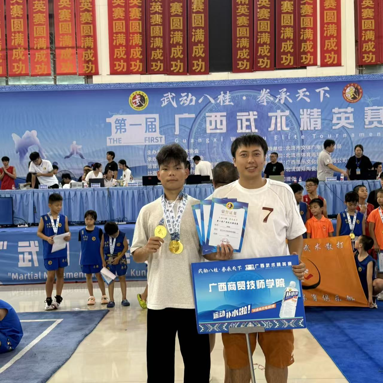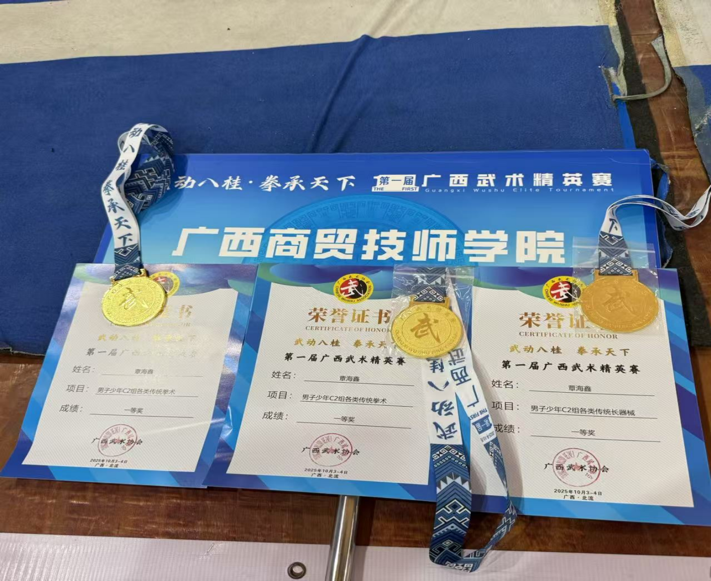 本次武术精英赛中,我院参赛选手消防2401班覃海鑫(学院武术社社长)凭借平时刻苦训练、扎实的功底与顽强意志,一举斩获3枚金牌,分别为:男子少年C2组传统拳术·少林七星拳;男子少年C2组传统拳术·少林通背拳;男子少年C2组传统长器械·少林阴手棍项目。