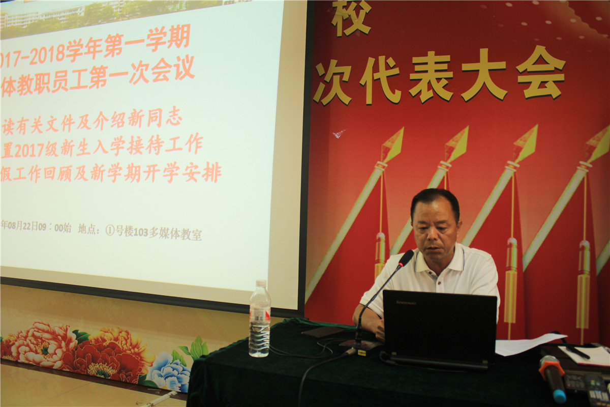 黄学军校长首先就上学期及假期中持续进行的几项工作进行了简单回顾和总结;将新学期学校确定的重点工作和近期主要日程安排进行传达部署,并对新学期工作提出要求:一是精心组织,全力以赴,和谐迎新;二是严肃纪律,整顿作风,优质服务。新学期各部门要进一步相互配合,团结协作,教师们各负其责,各尽所能,紧紧围绕重点工作,促进教学质量的全面提升,进行扎实创新和有效探索,争取新的学期学校各项工作再上新台阶!