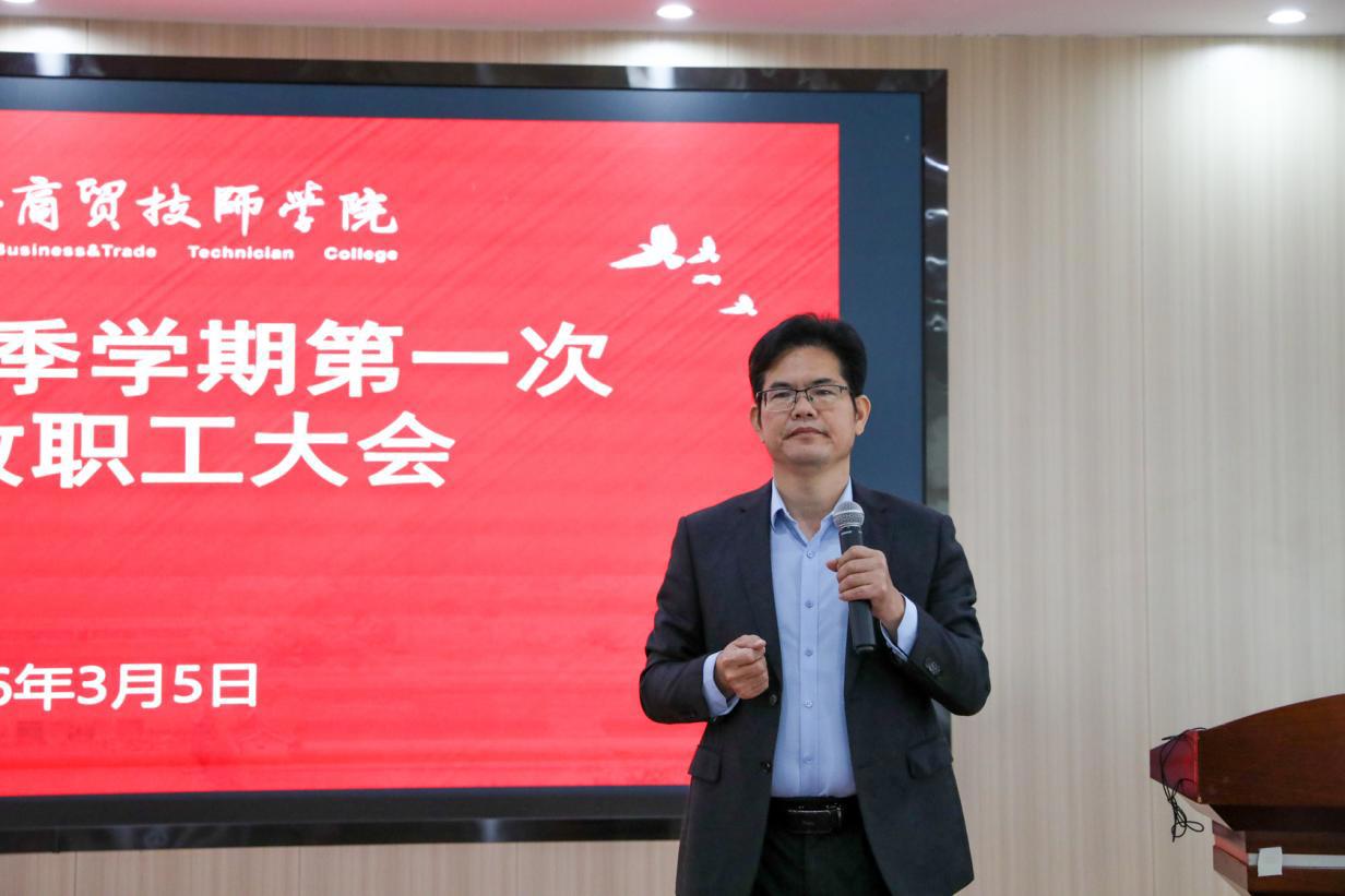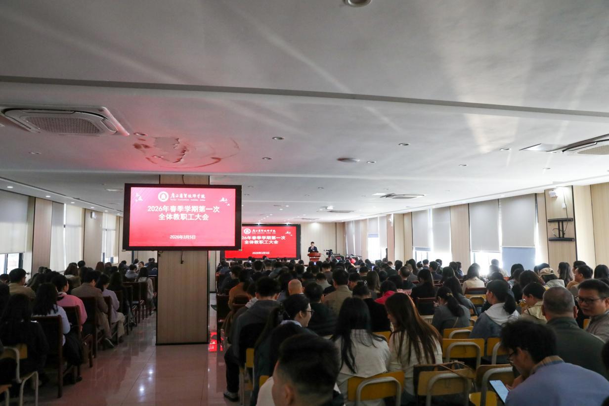 春潮涌动,万象更新。3月5日,广西商贸技师学院召开2026 年春季学期第一次全体教职工大会,学院领导班子及全体教职工参会,总结寒假工作、研判发展形势、部署新学期任务,凝聚共识合力,开启学院高质量发展新征程。