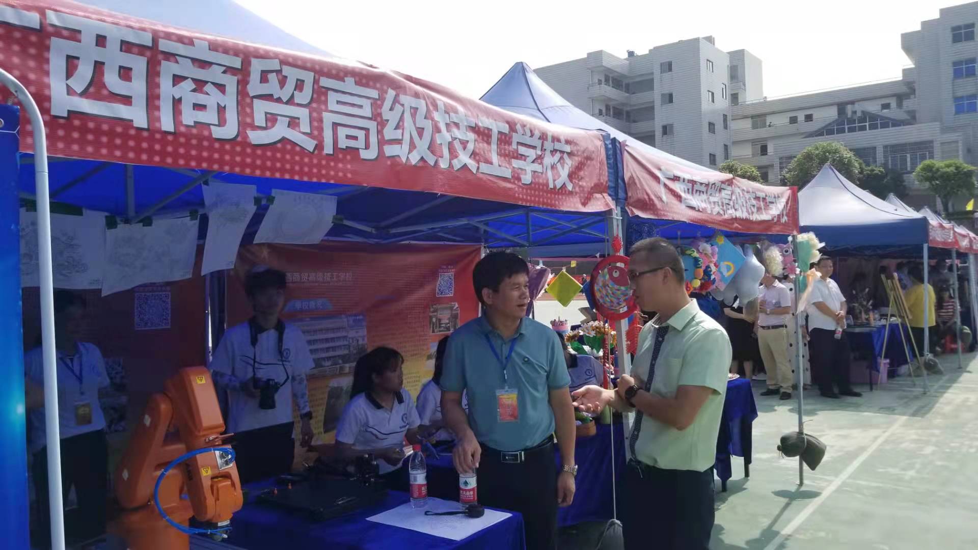 本次活动的主题是“技能成才、技能报国”,设桂林市主会场和各市分会场,主会场设在桂林技师学院,广西各级人力资源社会保障部门、企业代表和技工院校师生代表等约1000人参加主会场活动,主要内容为展示各技工院校、职业院校的办学成果、专业特色,请现场观众亲身体验职业教育项目。在宣传展示活动中,我校通过工业机器人应用与维护专业工业机器人操作展示、幼教专业学生作品展示与现场手工制作等形式来宣传学校在技能人才培养方面的优秀成果,展区吸引了众多观众驻足参观。活动过程中,自治区人社厅领导一行对参与活动的展位进行了走访,在我校的展位前,宋成多校长亲自向领导们宣传介绍学校的技能人才培养教育成果。