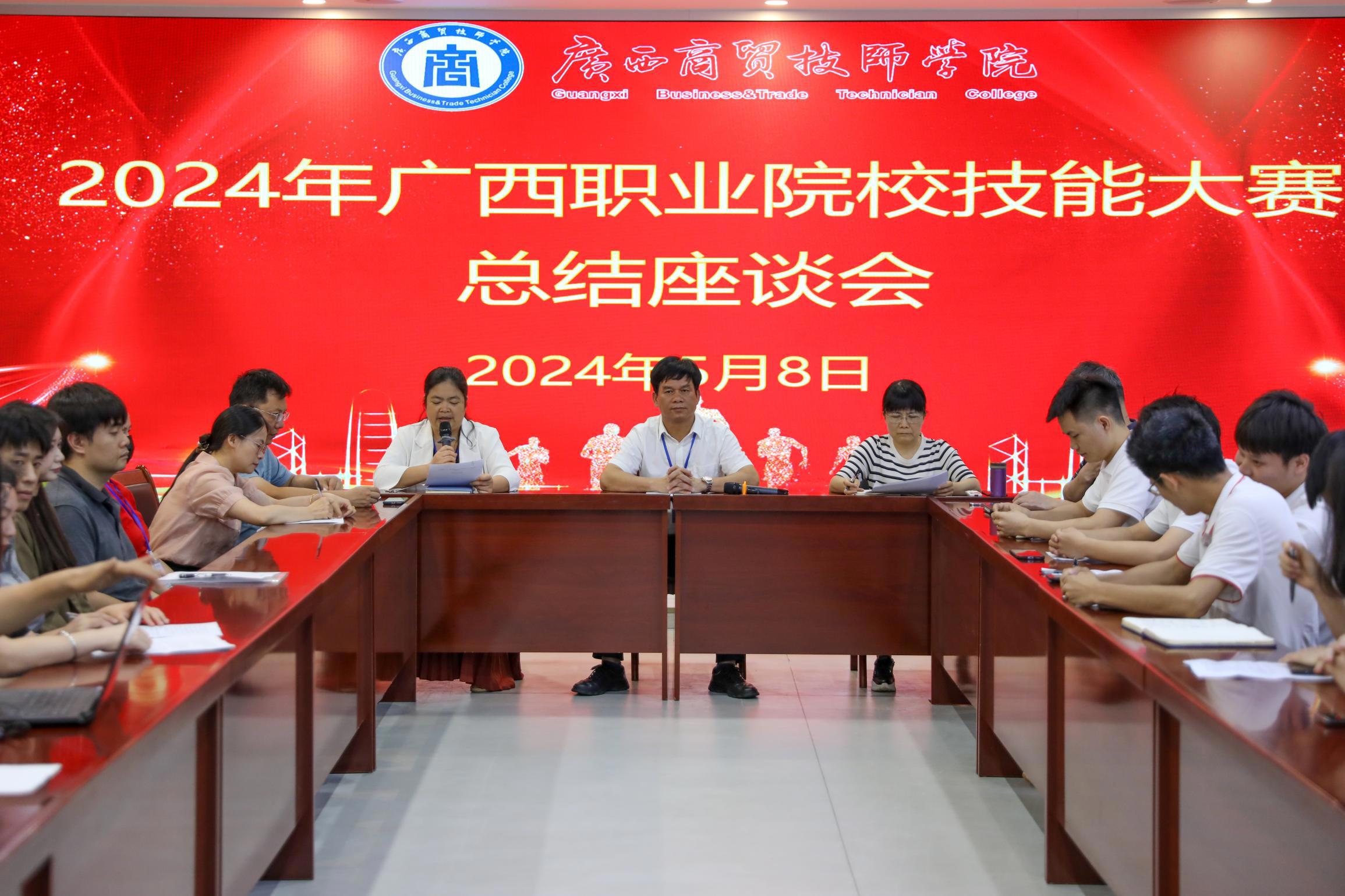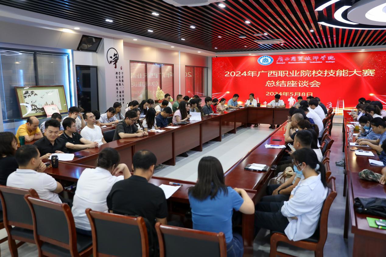 2024年5月8日下午,学院教务科在明阳校区校史馆召开“2024年广西职业院校技能大赛总结座谈会”。学院党委书记、院长宋成多、党委委员、副院长黄红波出席会议,教务科正副科长、各教研室主任及79位指导老师参加了总结座谈会。