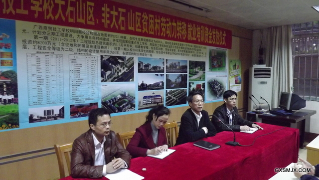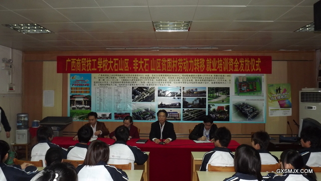 2012年3月23日上午7:40在学校1栋1楼多媒体教室举行大石山区、非大石山区贫困村劳动力转移就业培训2011-2012学年补助资金发放仪式,为全校享受大石山区、非大石山区贫困村学生893名共颁发资助金1210800元。出席仪式的有主管学生管理的何家林副校长、学生科科长梁朝阳老师、副科长谭丽君老师、农琦老师以及部分班主任代表和学生代表。会议由何家林副校长主持。