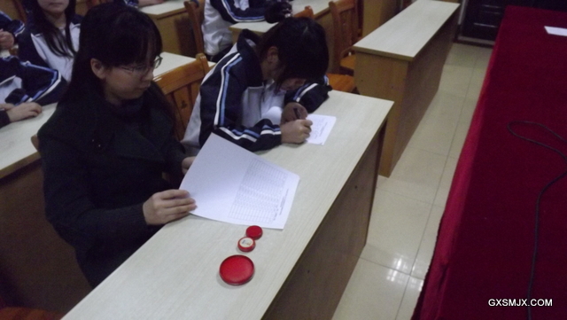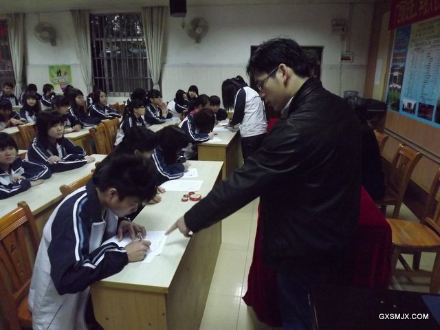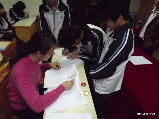 班主任邓雪献老师在组织学生填写签领表