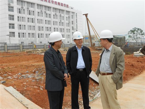 各位领导边考察边向黄学军校长了解新校区建设情况