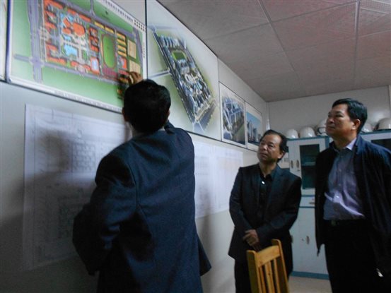 邓副校长在建设工地办公室向领导们介绍明阳新校区建设规划情况