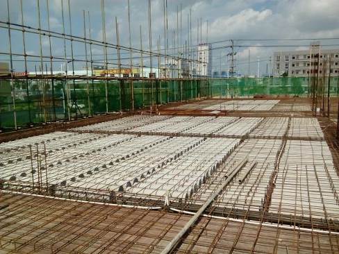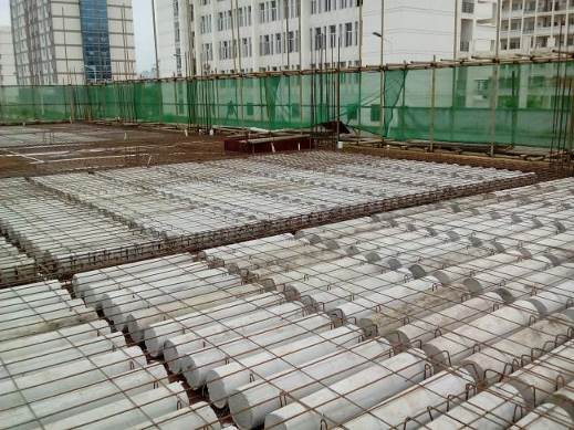 2015年6月12日,教学实训综合大楼项目工程二层楼面(1-8轴)进行空心楼板内模(采用BDF薄壁管状的内模)的安装,同时进行三层楼面(9-23轴)的支架网管安装。