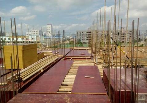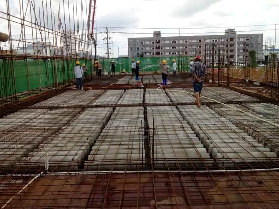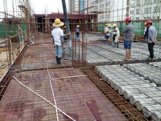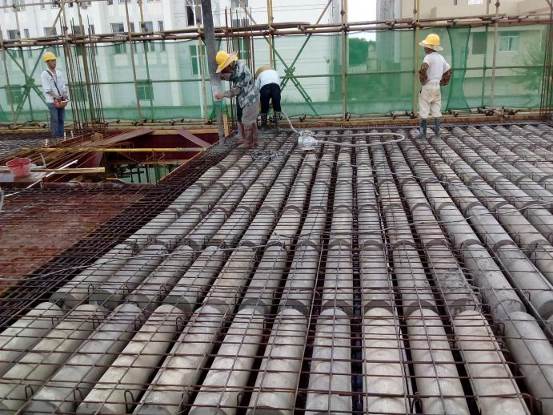 1. 2015年6月9日,进行2层楼面模板、钢筋、空心楼板内模(采用BDF薄壁管状的内模)的安装和浇筑混泥土施工。