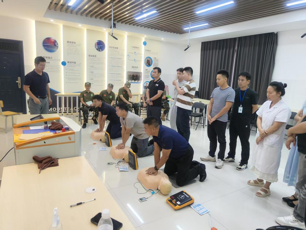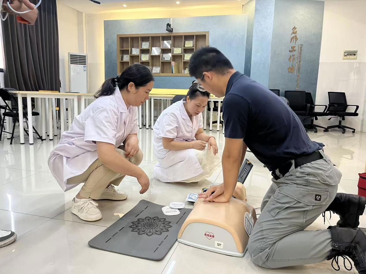 在实操环节,总务科、学生科、保卫科及教官队成员分别利用人体模型反复练习胸外按压节奏控制,导师卢杰现场认真指导。