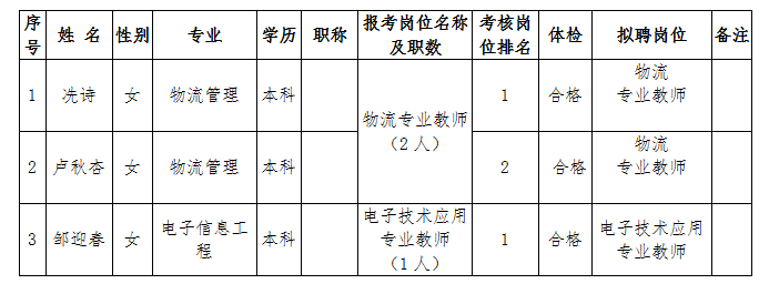 广西商贸技工学校2015年公开招聘天津职业技术师范大学2016年应届毕业生工作人员笔试、面试、考核、体检均已完成,根据《广西壮族自治区事业单位公开招聘人员实施办法》(桂人社发〔2011〕155号)和自治区人社厅办公室《关于组织2015年赴天津职业技术师范大学急需紧缺专业技能人才招聘会的通知》精神和《广西商贸技工学校2015年招聘天津职业技术师范大学2016年应届毕业生工作人员公告》的相关规定,经学校党委研究,拟聘用冼诗等3名同志(具体名单附后),现将拟聘用人员名单予以公示,公示期7个工作日(2016年7月11日—2016年7月19日)。对拟聘用人员如有异议,请以书面形式、并署真实姓名和联系地址,于2016年7月19日前邮寄或直接送广西商贸技工学校公开招聘工作领导小组办公室(直接送的以送达日期为准;邮寄的以邮戳为准)。