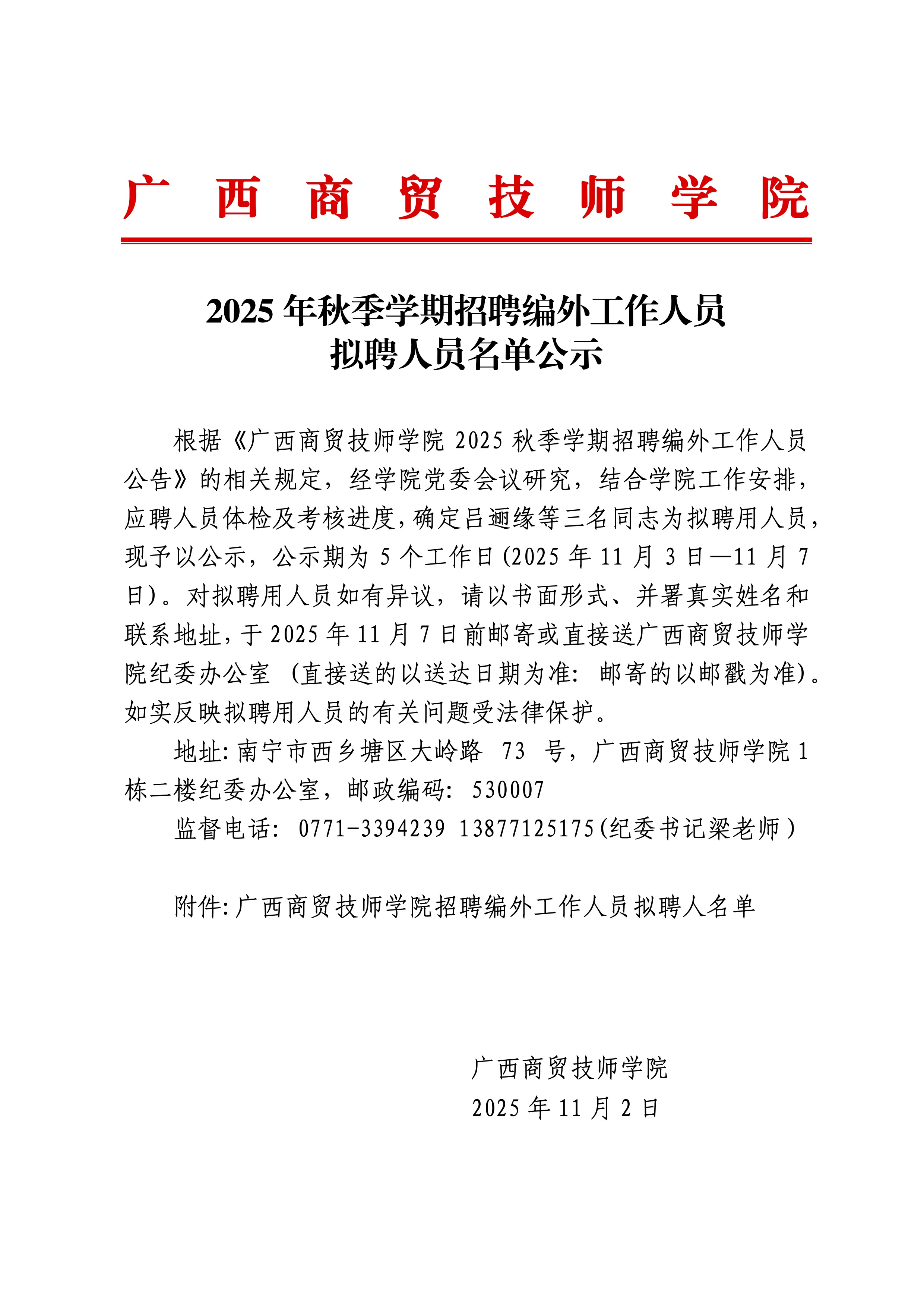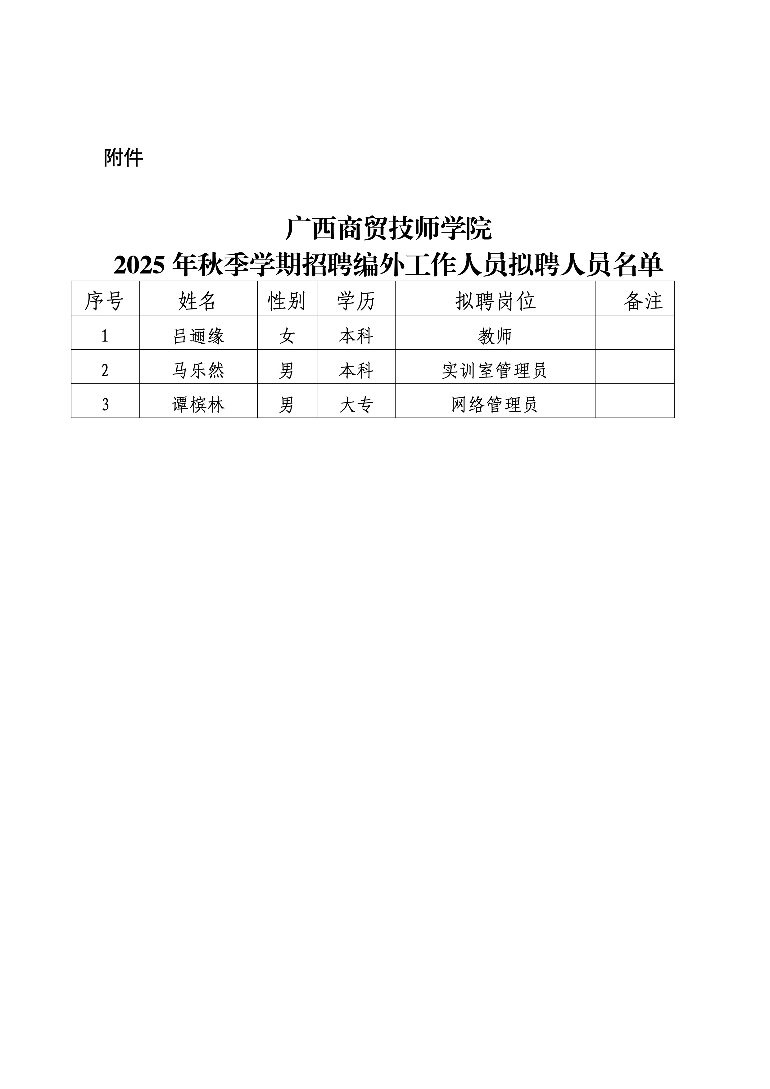 广西商贸技师学院2025年秋季学期拟录用名单公示