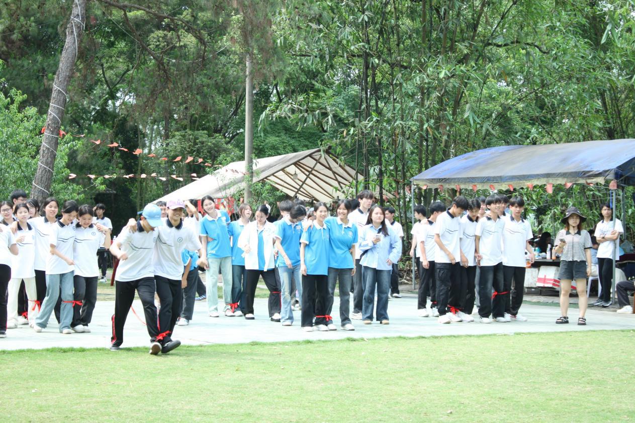 活动伊始,精彩纷呈的素质拓展项目正式拉开帷幕。“两人三足”“急速传信”等素质拓展项目相继开展。“两人三足”中,两人一组绑腿相挽、齐声喊号前进,小组间或默契冲刺或相互扶持,赛场欢笑声此起彼伏,充分展现团队协作精神;“急速传信”规则创意十足,成员需接力传递信物,首轮选手手掌托物奔跑,双数编号同学则以胸腹承物、无手辅助平衡加速。各项目以小组积分制竞赛,最终按累积分数颁发相应精美奖品。
