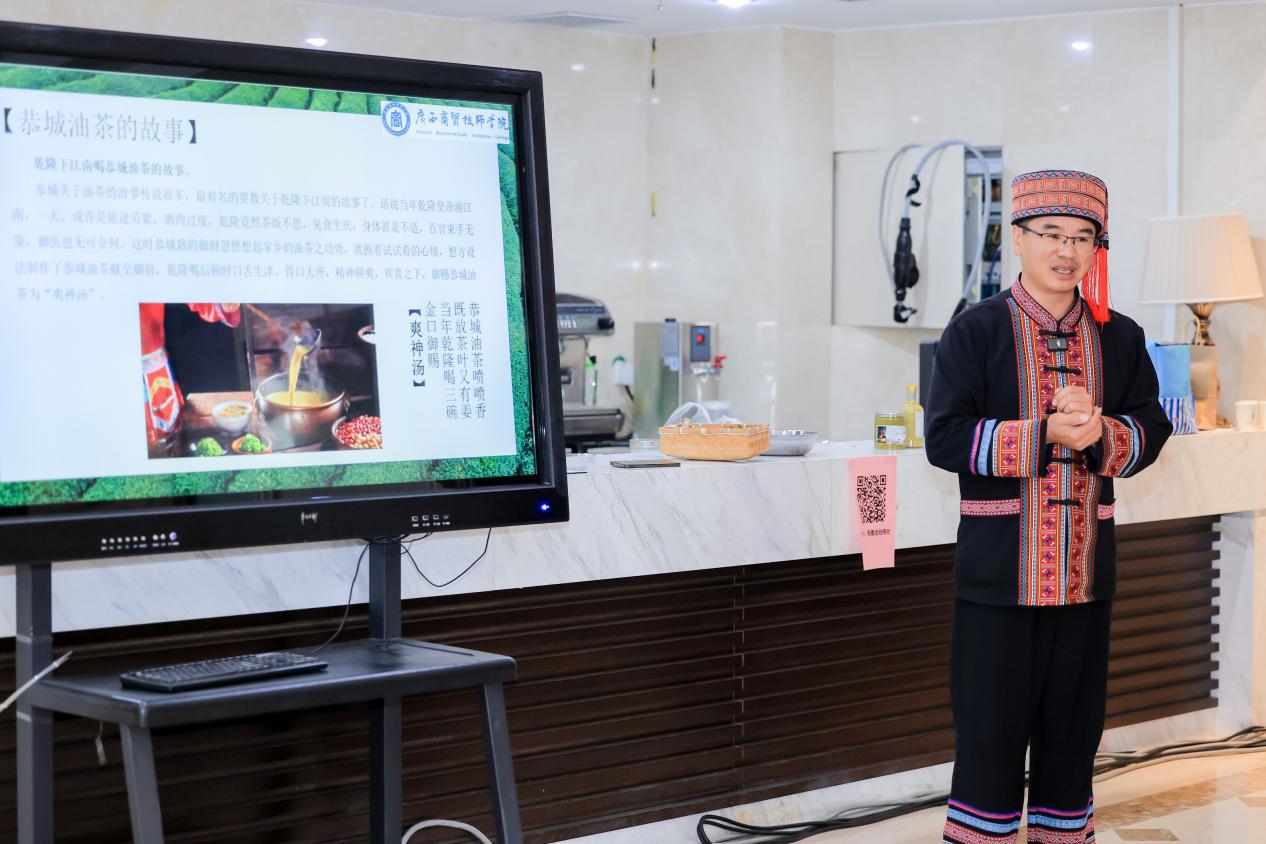 在技能培训班的课堂上,周黎维大师详细讲解瑶族油茶的历史渊源、文化价值以及我院师生制作技艺的传承情况,并与杨思靖老师展示非遗文化瑶族油茶独具特色的制作技艺,进行瑶族油茶技艺教学,品鉴瑶族传统油茶。学员们近距离感受到瑶族油茶习俗文化的独特魅力,领略了中国非物质文化遗产的深厚底蕴,促进瑶族油茶习俗文化广泛传播。