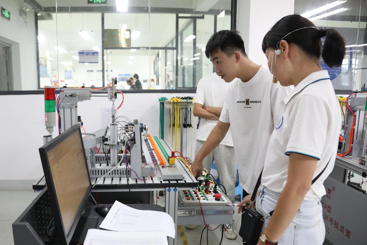 工业机器人专业学生体验机电一体化设备警示灯的使用
