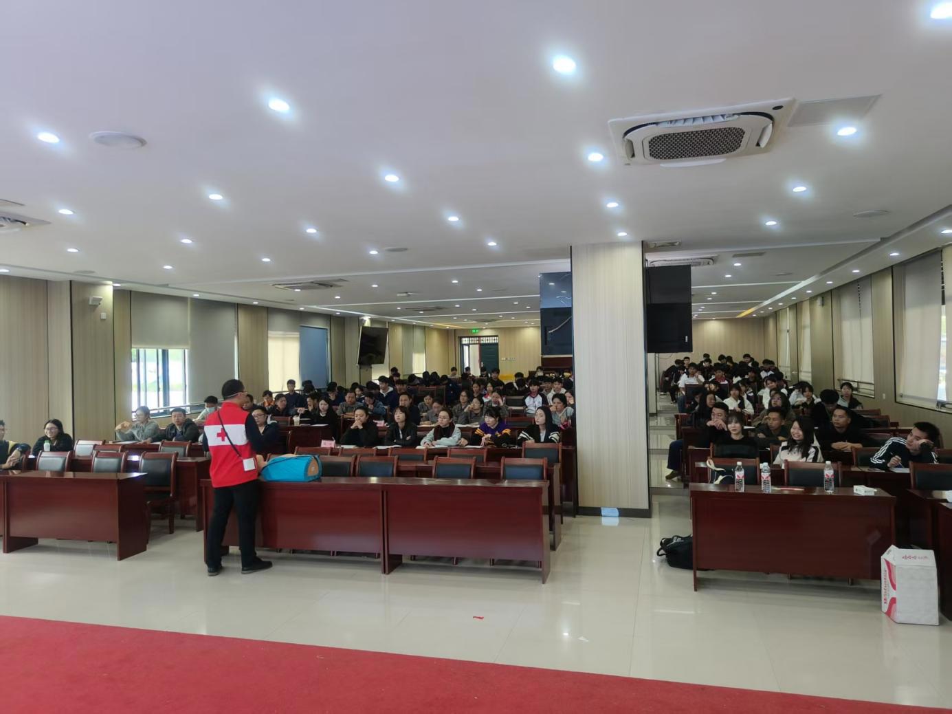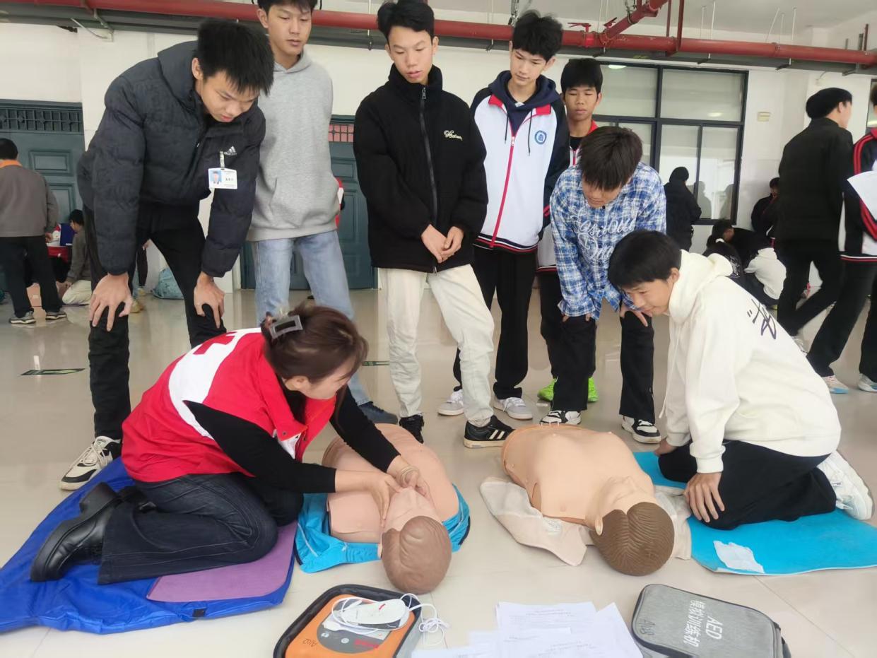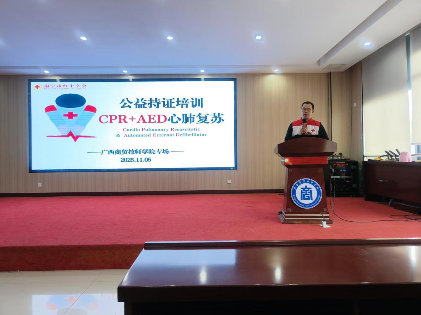 为普及应急救护知识,提升师生应对突发状况的能力,11月5日下午,广西商贸技师学院联合南宁市青秀区红十字会举办第二期心肺复苏(CPR)与自动体外除颤器(AED)专项技能培训。本次培训共有153名师生参与,队伍由学院班主任、明阳校区护校队、消防2301、2401、2502班学生。
