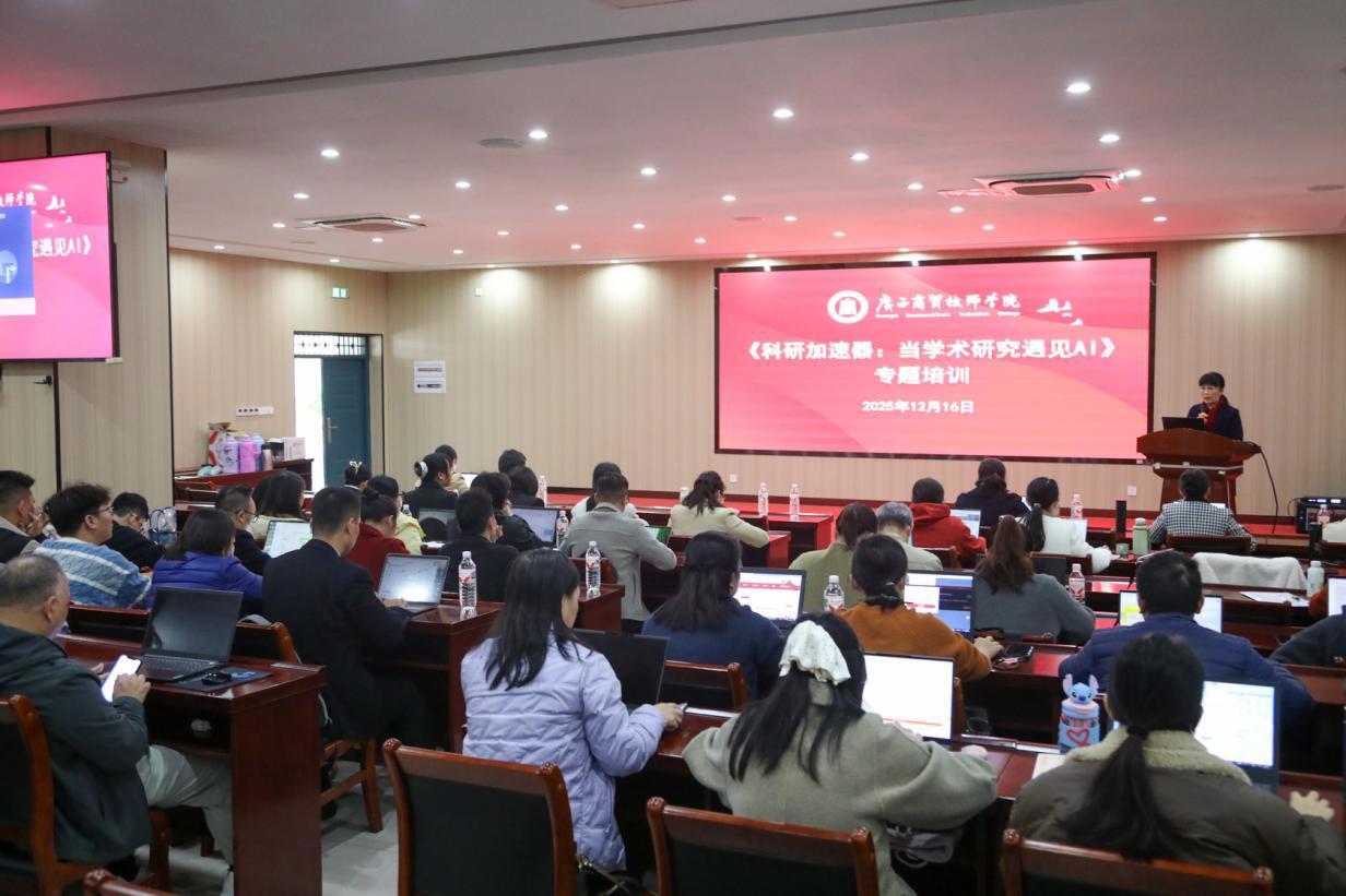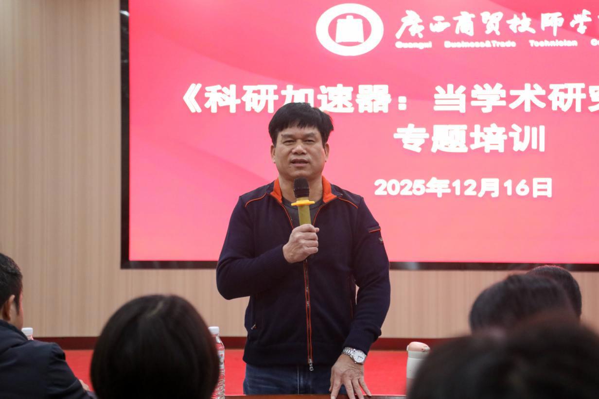 2025年12月16日,由广西商贸技师学院教学督导研究室组织的《科研加速器:当学术研究遇见AI》专题培训,在我院明阳校区笃学楼报告厅圆满落幕。学院党委书记、院长宋成多,学院党委委员、副院长黄红波,学院党委委员、副院长李洁琛出席会议。来自广西新闻出版高级技工学校、广西邮电技工学校、广西华南烹饪技工学校、广西群贤技工学校的领导、科研团队成员及我院科研骨干教师共50余人参加此次培训。