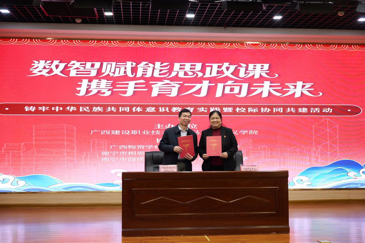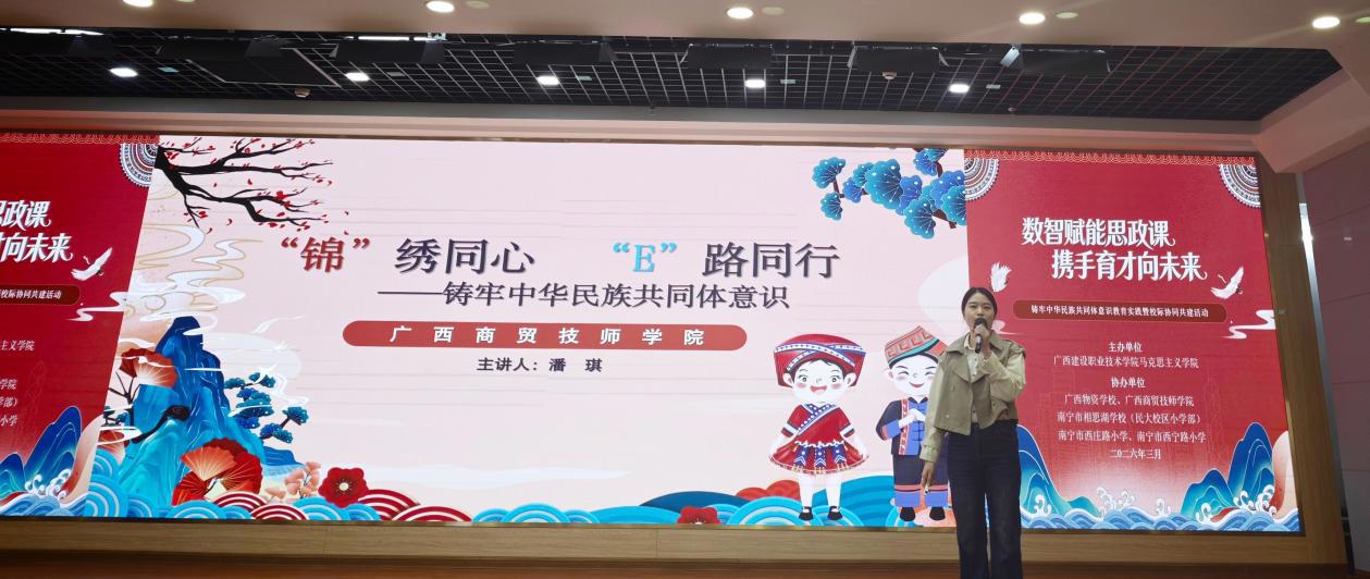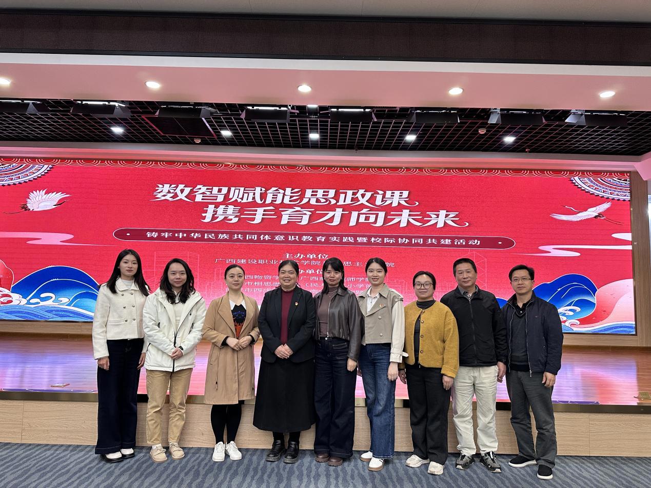为深入学习贯彻党的二十届四中全会精神,推进大中小学思政教育一体化建设,深化新时代学校思想政治理论课改革创新,2026年3月10日,我院与广西建设职业技术学院、广西物资学校、广西民族大学附属小学等6所院校联合开展“数智赋能思政课 携手育才向未来——铸牢中华民族共同体意识”教育实践暨校际共建活动。教务科科长刘艳飞带队,8位思政课教师参加了本次活动。
