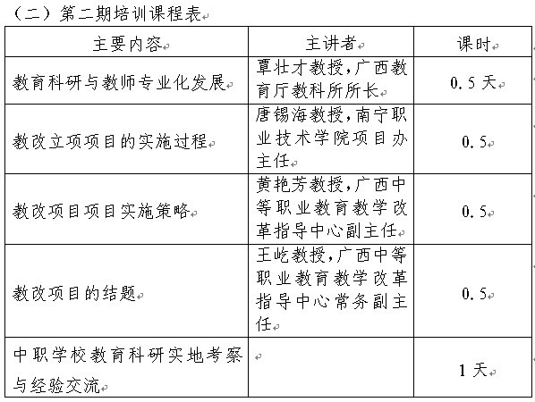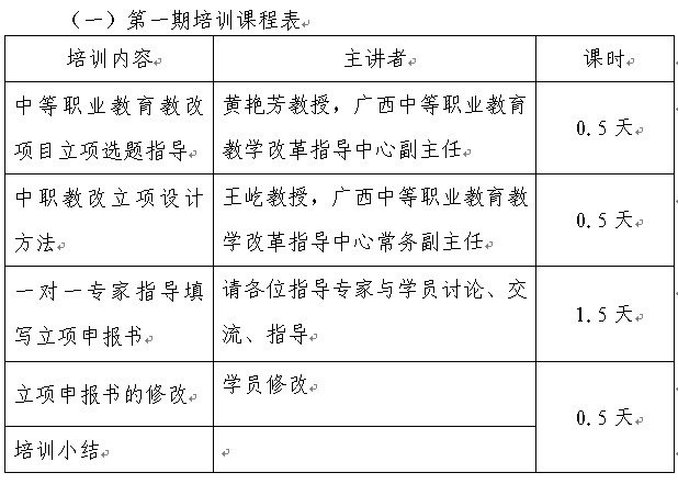 根据教育厅《关于组织申报2011年度中等职业教育教改项目的通知》(桂教职成〔2011〕17号)的精神,今年广西中等职业教育教学改革项目立项在2011年6月10日前申报。应各中职学校的要求,本期培训班将针对教改立项方面进行专题培训,指导各中职学校根据本校的实际情况填写《立项申报书》,并邀请专家为各校进行诊断,一对一辅导,互动交流,提高各中职学校的立项设计水平。具体培训内容如下: