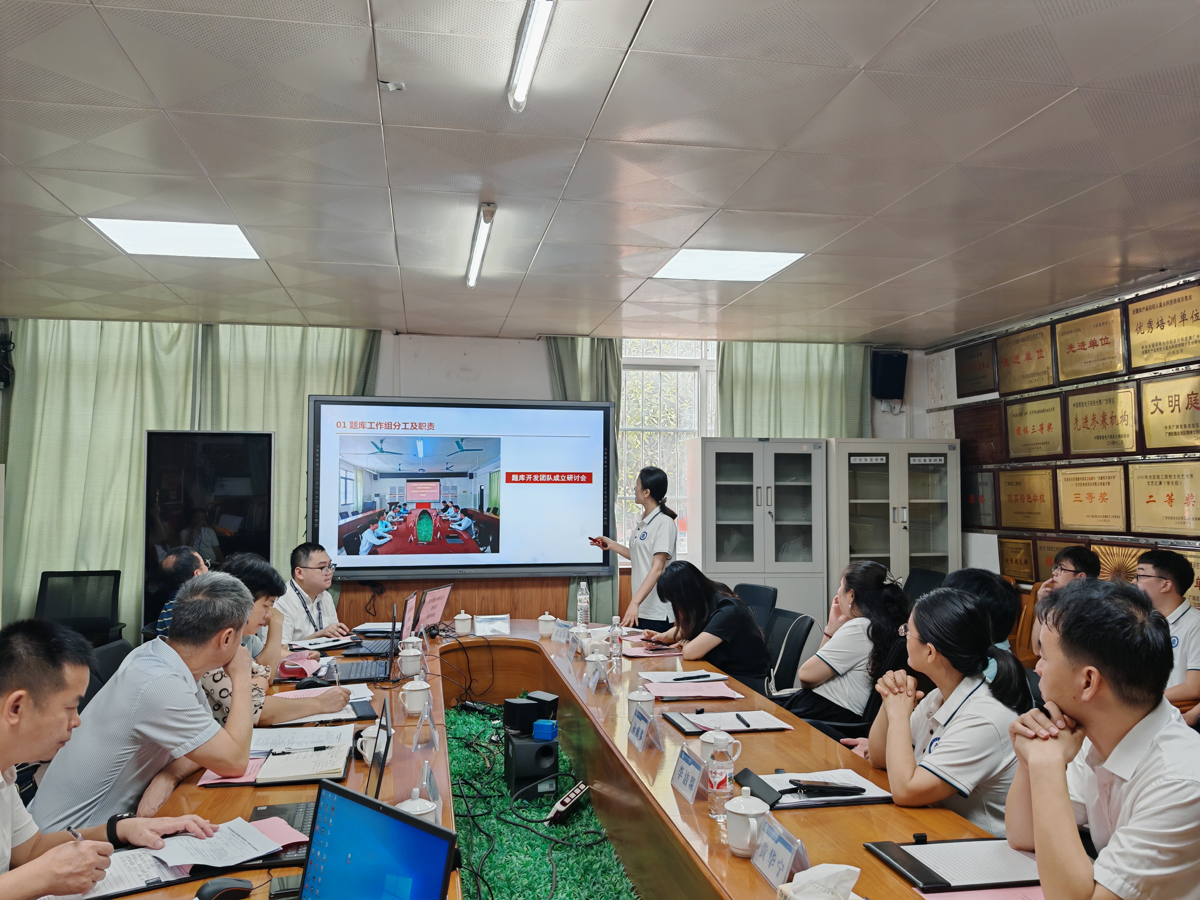 7月7日上午,广西壮族自治区职业技能鉴定中心评价指导科负责人桂林、科员覃晓霞和题库评审专家、方法专家一行10人到我院召开广西壮族自治区职业技能等级认定题库评审会,对我院牵头开发的《信息通信网络运行管理员》《半导体分立器件和集成电路装调工》题库进行认真审核并做好入库工作。