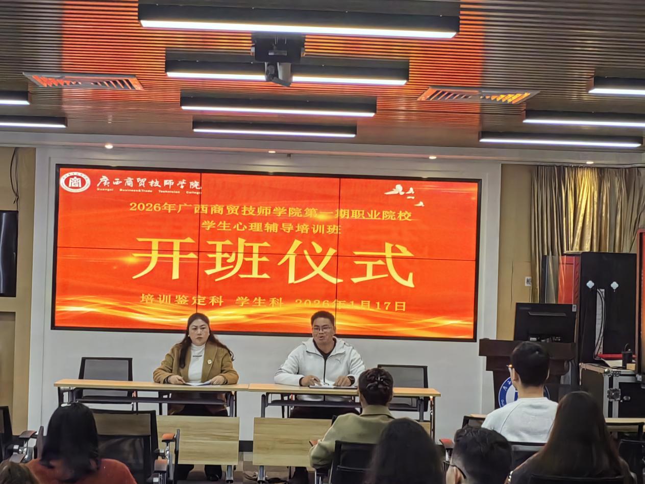 为提升教师心理辅导专业素养,筑牢学生心理健康防线,广西商贸技师学院2026年第一期职业院校学生心理辅导专项职业能力培训班于2026年1月17日正式开班。本次培训为期4天,学院骨干教师齐聚,开启专业能力提升之旅。