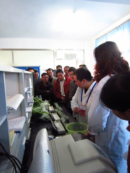 检测中心的工作人员在向学员们介绍快速检验农产品的方法