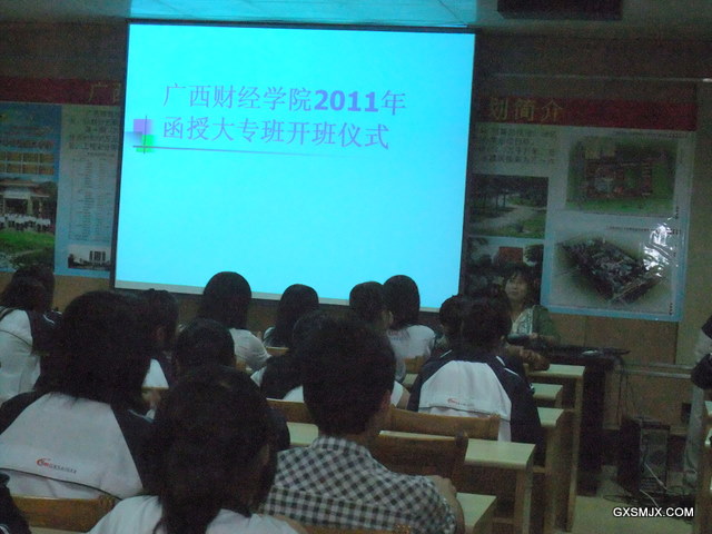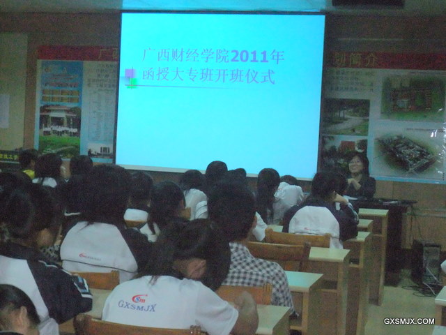 广西财经学院2011级函授大专班开班仪式于11月3日星期四晚七点半在一栋一楼多媒体教室举行,2011级函授大专班市场营销、会计专业上百名学生参加了开班仪式。2011级大专班学生主要来自我校各个专业的2011级新生,还有部分来自2010级学生及09级在校外实习的学生,甚至还有不少是已毕业多年的我校学生。大专班主要负责人邓雪献老师主持了本次仪式,仪式上培训鉴定科科长黄碧华老师给同学们做了热情洋溢的讲话,使同学们深受鼓舞,信心大增。最后,邓老师就上课的要求和注意事项给同学们做了充分的说明。2011年秋季学期广西财经学院函授大专班将于本周六正式上课。